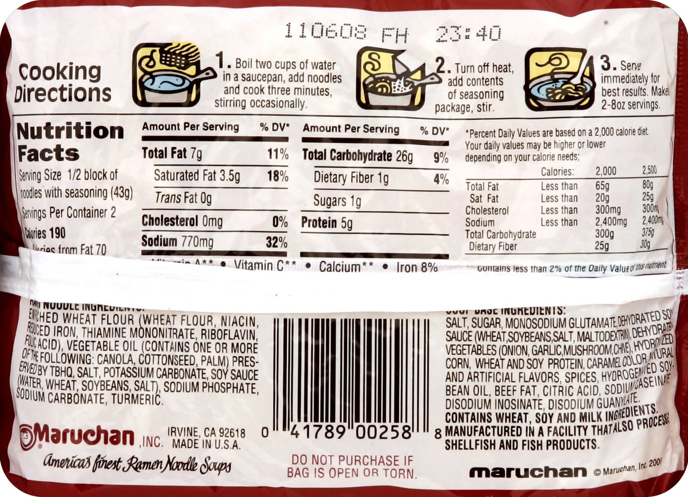 Ingredients: Ramen Noodle: Enriched Wheat Flour (Wheat Flour, Niacin, Reduced Iron, Thiamine Mononitrate, Riboflavin, Folic Acid), Vegetable Oil (Contains One or More of the Following: Canola, Cottonseed, Palm) Preserved by TBHQ, Contains Less than 1% of: Salt, Soy Sauce (Water, Wheat, Soybeans, Salt), Potassium Carbonate, Sodium (Mono, Hexameta, and/or Tripoly) Phosphate, Sodium Carbonate, Turmeric. Soup Base: Salt, Sugar, Monosodium Glutamate, Contains Less than 1% of: Hydrolyzed Corn, Wheat and Soy Protein, Dehydrated Vegetables (Onion, Garlic, Chive), Maltodextrin, Caramel Color, Dehydrated Soy Sauce (Wheat, Soybeans, Salt), Natural and Artificial Flavors, Spices, Partially Hydrogenated Soybean Oil, Corn Syrup Solids, Sodium Caseinate (Milk Derivative), Yeast Extract, Beef Fat, Citric Acid, Disodium Inosinate, Disodium Guanylate Contains: Milk, Soybeans, Fish, Wheat