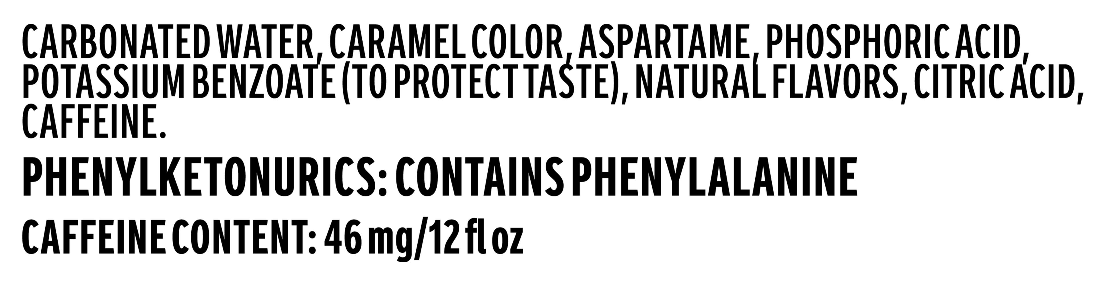 Ingredients: Carbonated Water, Caramel Color, Aspartame, Phosphoric Acid, Potassium Benzoate (To Protect Taste), Natural Flavors, Citric Acid, Caffeine. Contains 46mg of caffeine