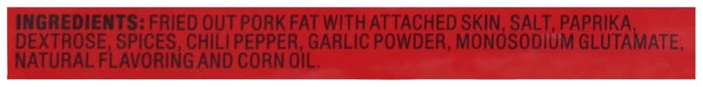 Ingredients: Fried Out Pork Fat with Attached Skin, Salt, Paprika, Dextrose, Spices, Chili Pepper, Garlic Powder, Monosodium Glutamate, Natural Flavoring and Corn Oil