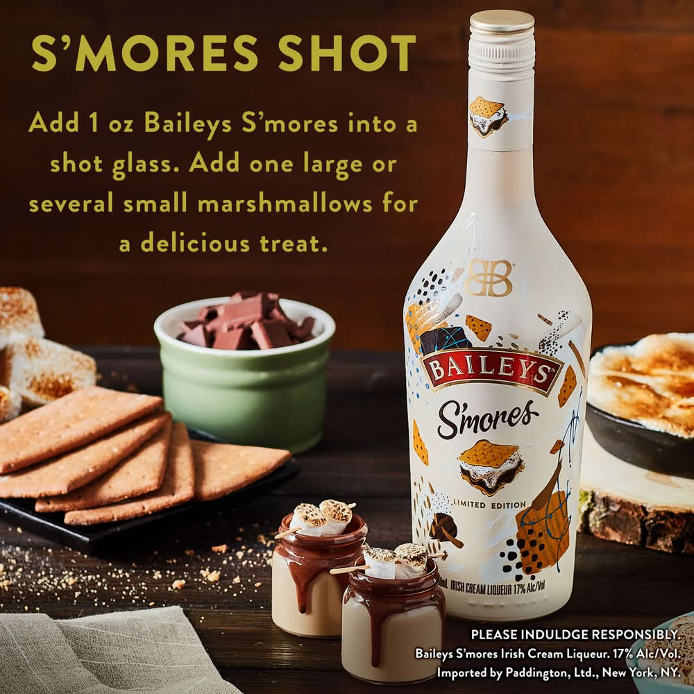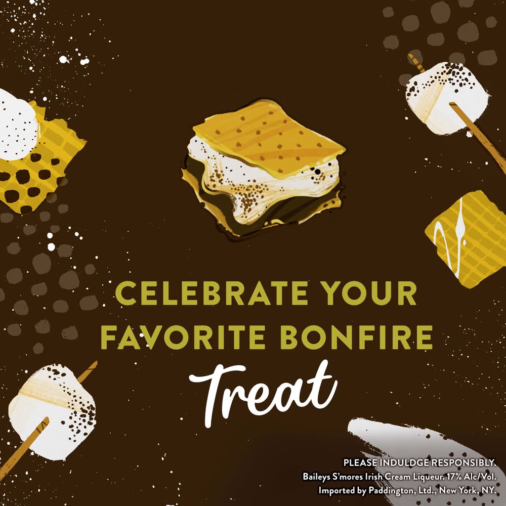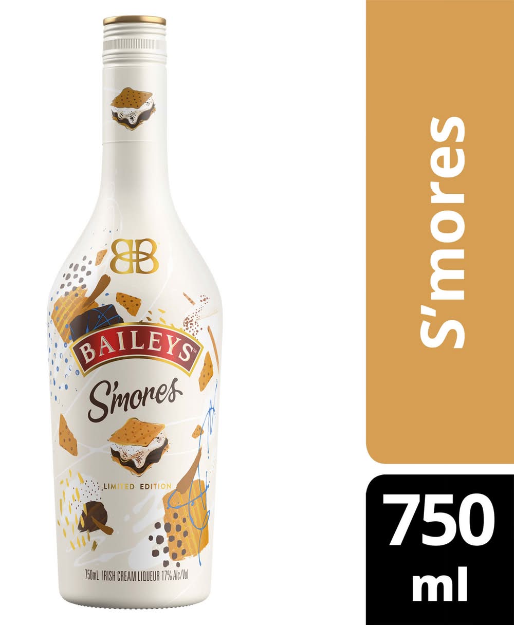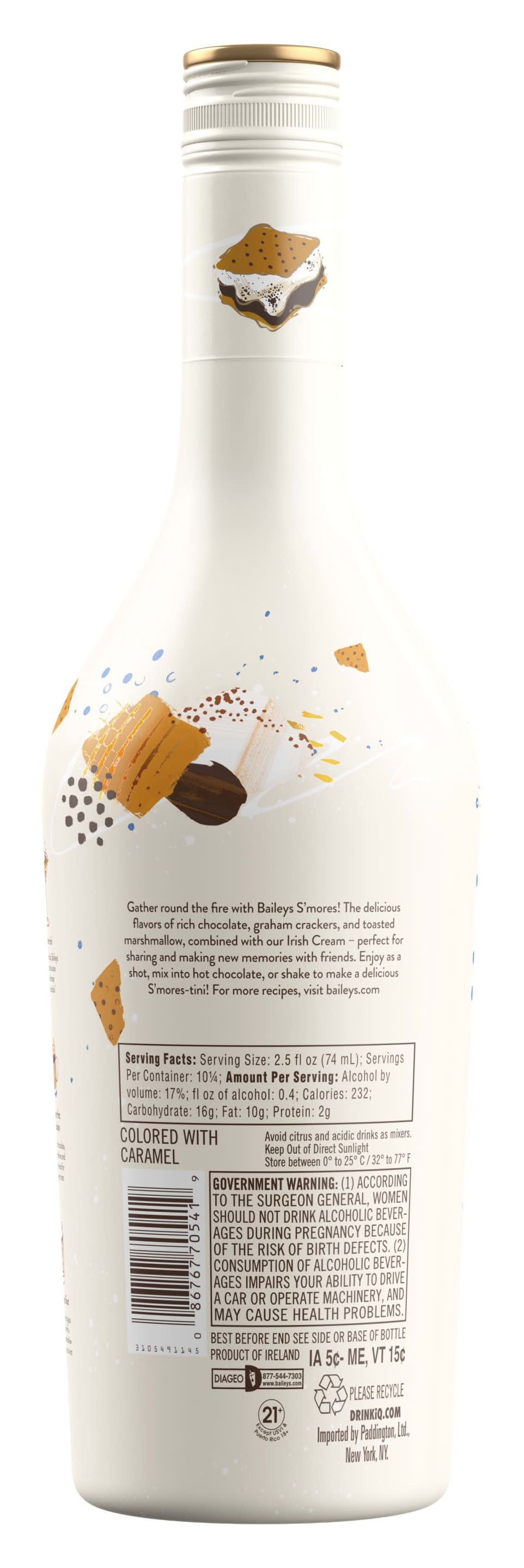 Savor the nostalgic flavors of toasted marshmallow, rich chocolate, and graham cracker with Baileys S’mores Irish Cream Liqueur. Our 34 proof Limited Edition liqueur celebrates your favorite bonfire treat. Baileys S’mores Liqueur combines the unmistakable taste of our Irish Cream with flavors of toasted marshmallows sandwiched between graham crackers and a melted chocolate finish for a sensational melt-in-your-mouth drink to elevate any occasion. Best enjoyed in a spiked coffee cocktail. Baileys S'mores Irish Cream Liqueur won a Gold medal at the 2022 San Francisco World Spirits Competition. Includes one 34 proof 750 mL bottle of Bailey’s S’mores Irish Cream Liqueur. Please drink responsibly. • Alcohol by volume: 17% • Packaging: Reusable