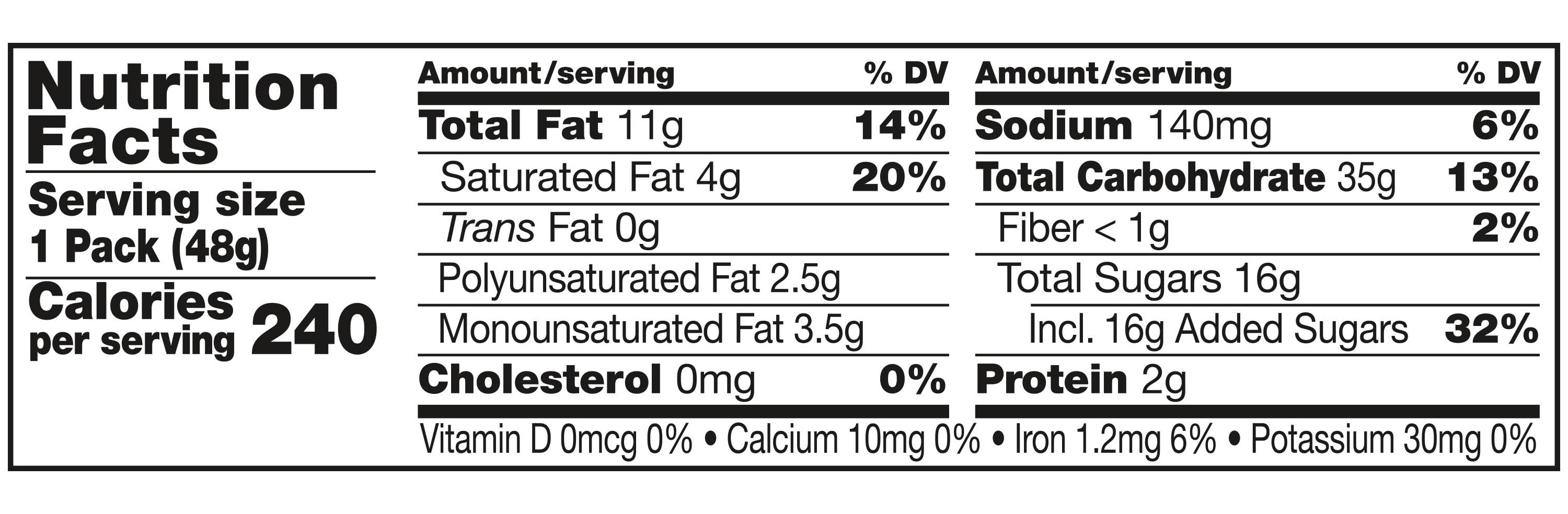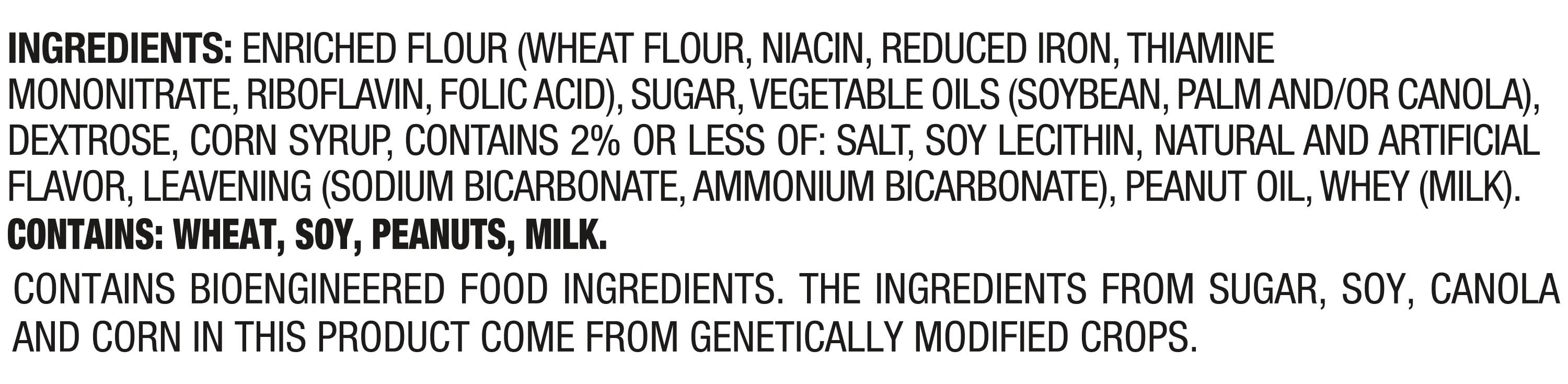 Ingredients: INGREDIENTS: ENRICHED FLOUR (WHEAT FLOUR, NIACIN, REDUCED IRON, THIAMINE MONONITRATE, RIBOFLAVIN, FOLIC ACID), SUGAR, VEGETABLE OILS (SOYBEAN, PALM AND/OR CANOLA), DEXTROSE, CORN SYRUP, CONTAINS 2% OR LESS OF: SALT, SOY LECITHIN, NATURAL AND ARTIFICIAL FLAVOR, LEAVENING (SODIUM BICARBONATE, AMMONIUM BICARBONATE), PEANUT OIL, WHEY (MILK), . CONTAINS: WHEAT, SOY, PEANUTS, MILK. Contains: CONTAINS: Gluten, Milk/Dairy, Peanut, Soybean, Wheat