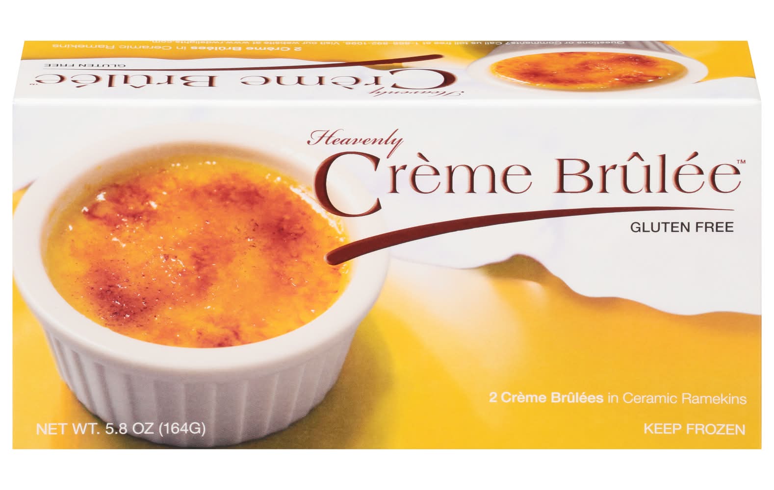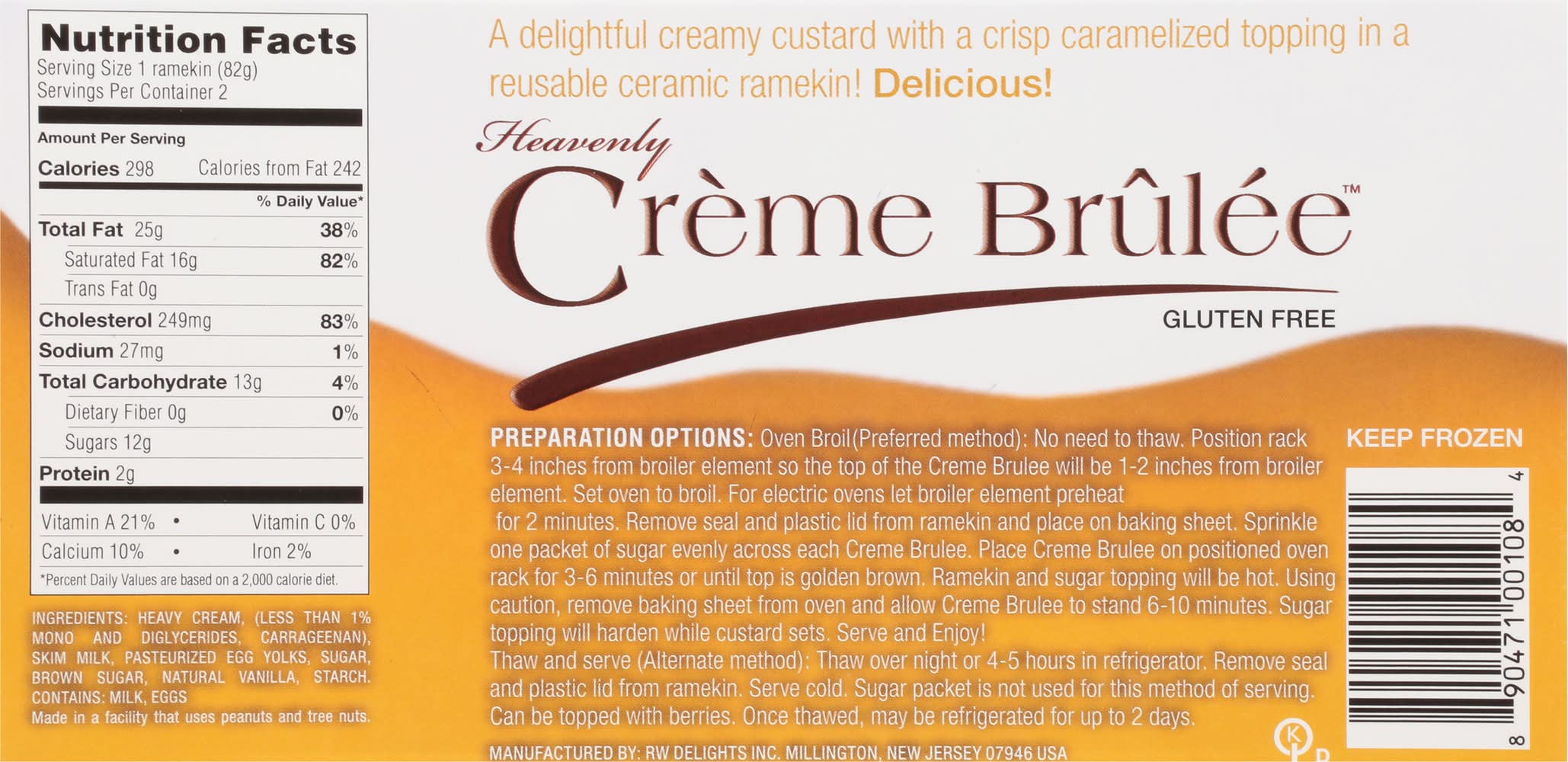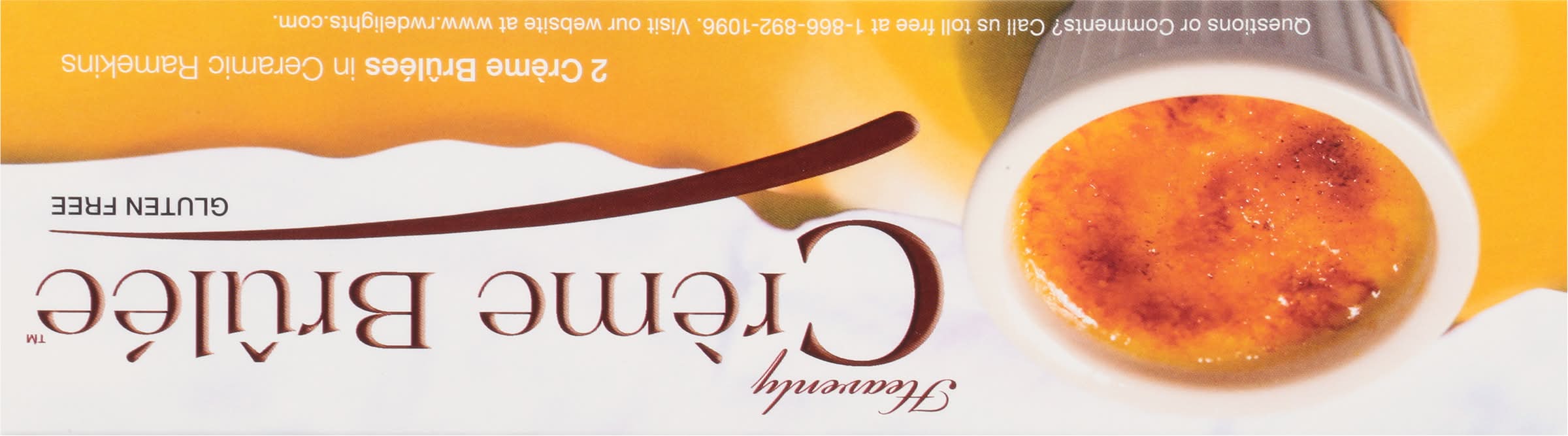 Gluten free. 0 g trans fat. A delightful creamy custard with a crisp caramelized topping in a reusable ceramic ramekin! www.rwdelights.com. Questions or comments? Call us toll free at 1-866-892-1096. Visit our website at www.rwdelights.com.