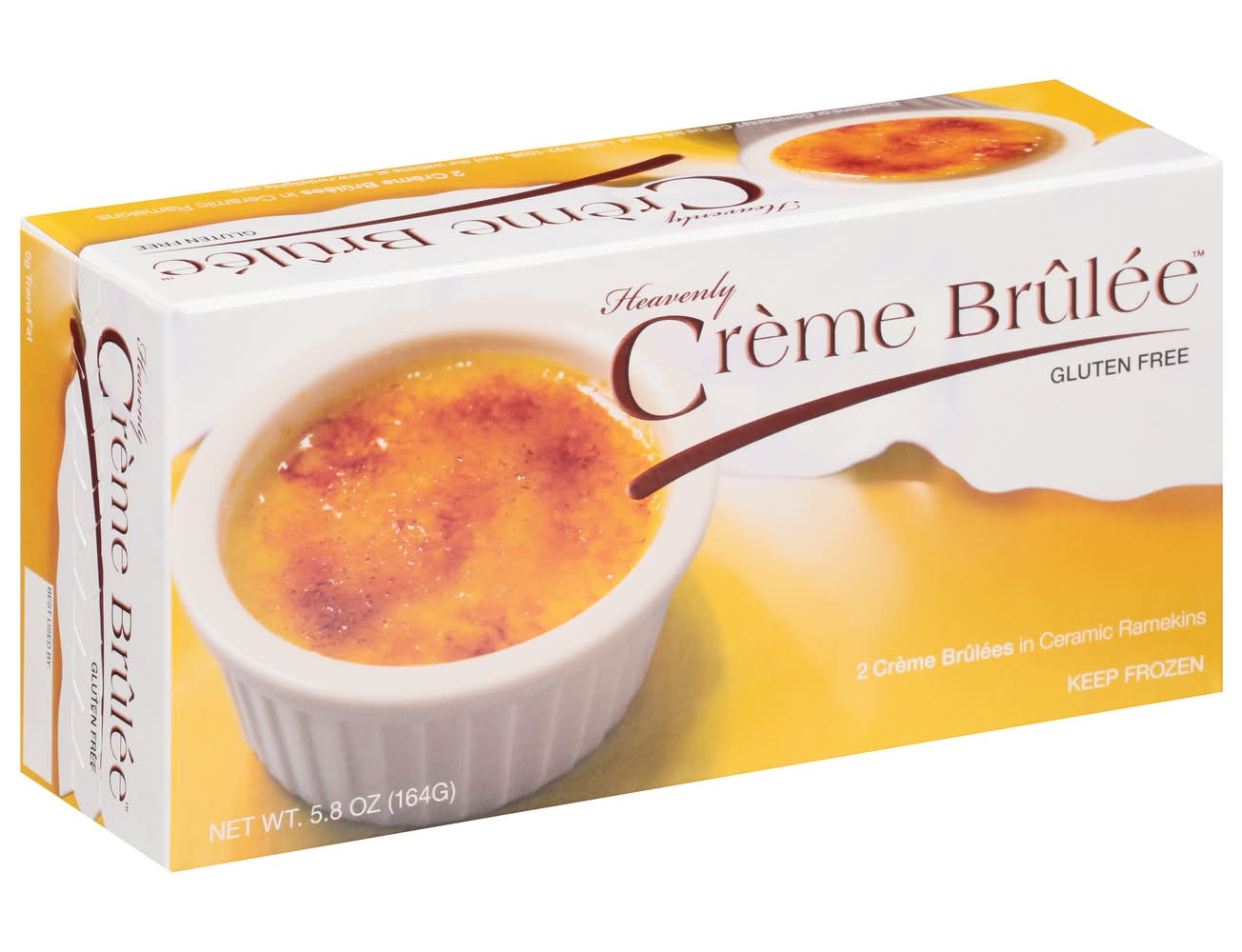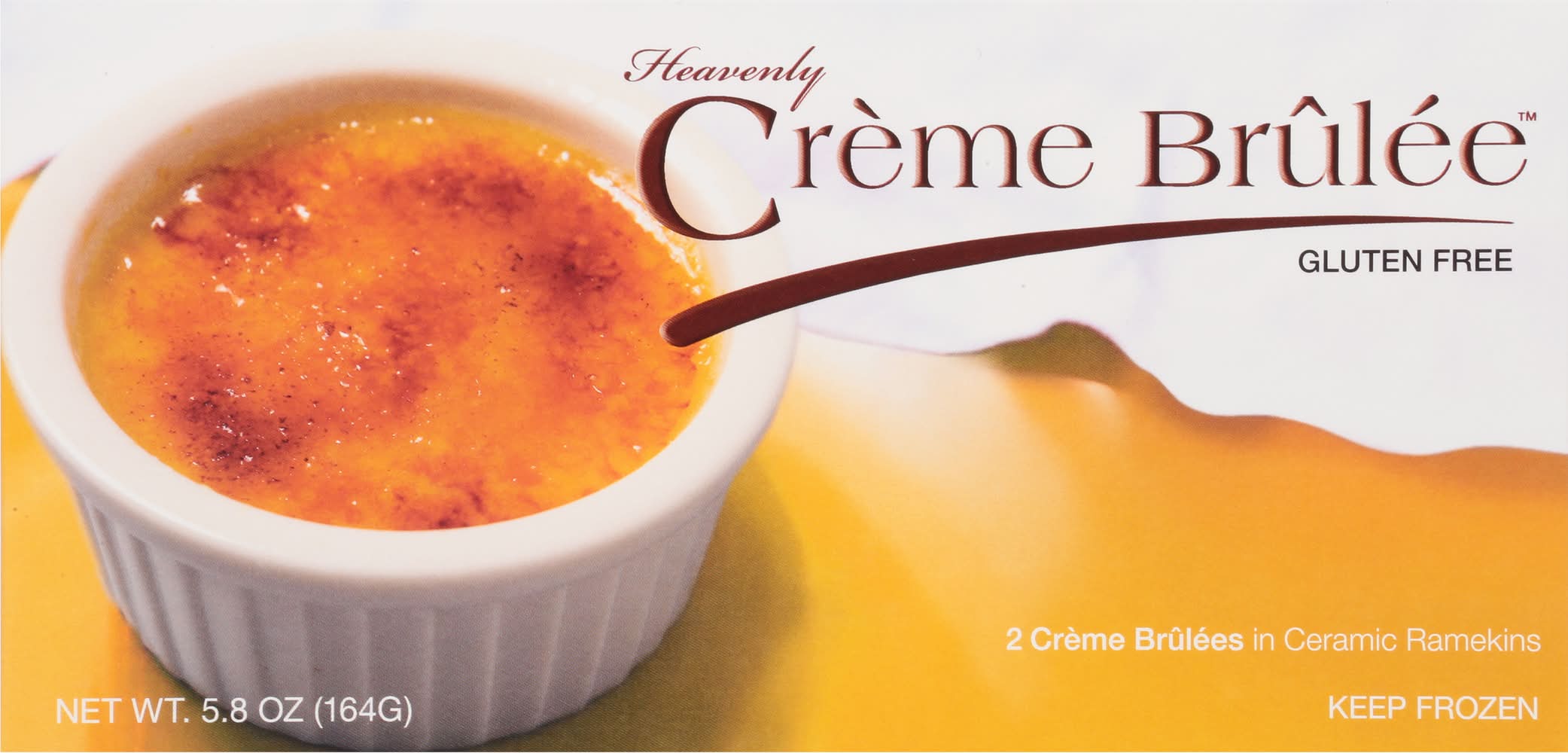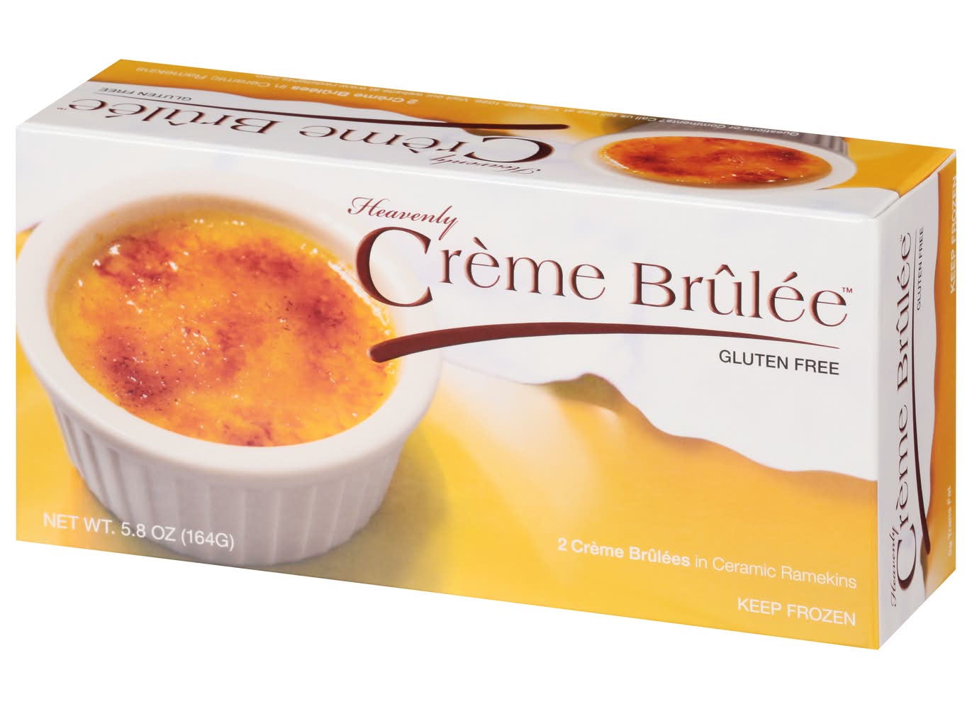 Gluten free. 0 g trans fat. A delightful creamy custard with a crisp caramelized topping in a reusable ceramic ramekin! www.rwdelights.com. Questions or comments? Call us toll free at 1-866-892-1096. Visit our website at www.rwdelights.com.
