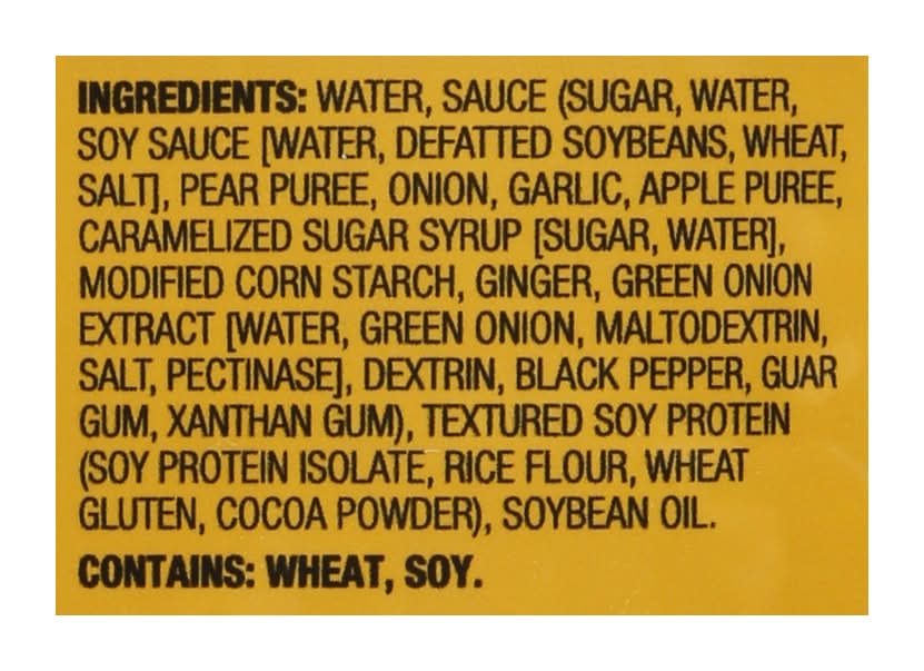 Ingredients: Hydrated Textured Vegetable Protein (Water, Soy Protein Isolate, Rice Flour, Wheat Gluten, Cocoa Powder), Sauce (Sugar, Water, Soy Sauce [Water, Defatted Soybeans, Wheat, Salt], Pear Puree, Onion, Garlic, Apple Puree, Caramelized Sugar Syrup [Sugar, Water], Modified Corn Starch, Ginger, Green Onion Extract [Water, Green Onion, Maltodextrin, Salt, Pectinase], Dextrin, Black Pepper, Guar Gum, Xanthan Gum), Soybean Oil Contains: Wheat, Soybeans, Gluten
