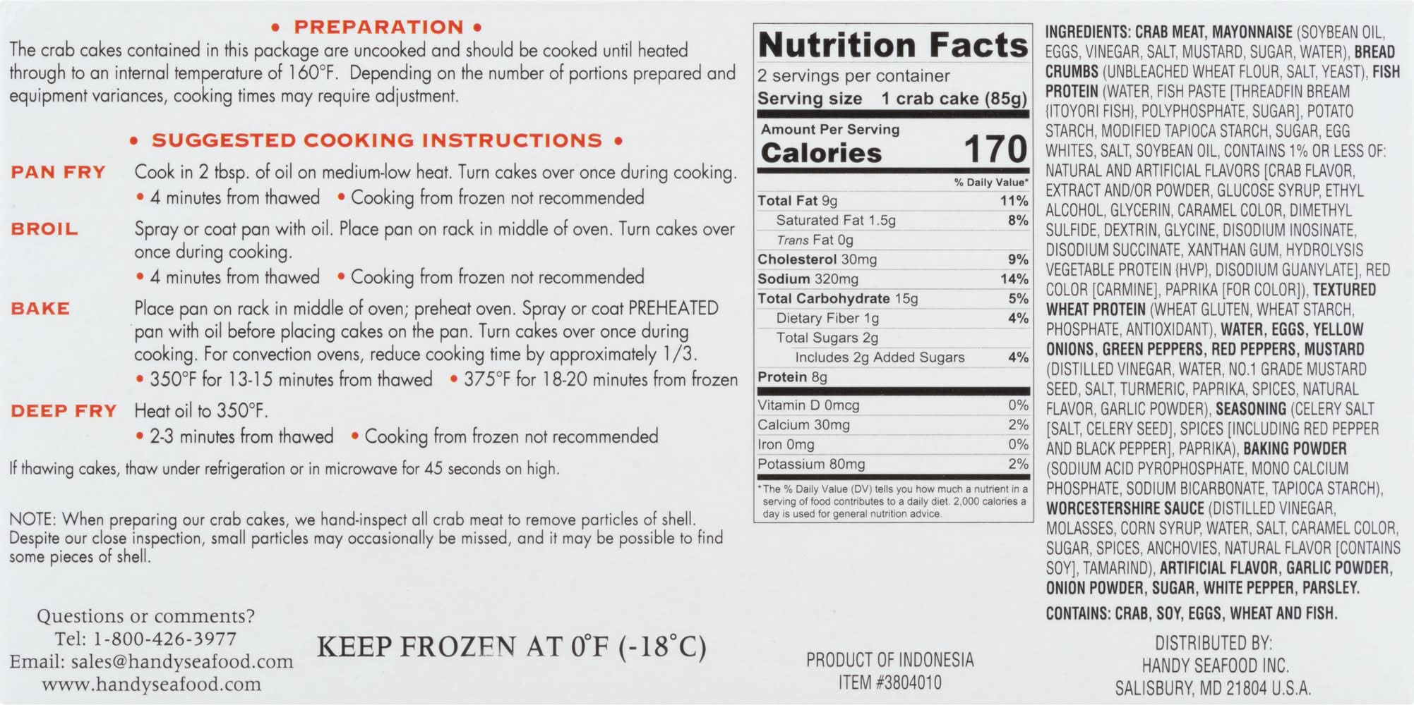 Ingredients: Crab Meat, Mayonnaise (Soybean Oil, Eggs, Vinegar, Salt, Mustard, Sugar, Water), Bread Crumbs (Unbleached Wheat Flour, Salt, Yeast), Fish Protein (Water, Fish Paste [Threadfin Bream (Itoyori Fish), Polyphosphate, Sugar], Potato Starch, Modified Tapioca Starch, Sugar, Egg Whites, Salt, Soybean Oil, Contains 1% or Less of: Natural and Artificial Flavors [Crab Flavor, Extract and/or Powder, Glucose Syrup, Ethyl Alcohol, Glycerin, Caramel Color, Dimethyl Sulfide, Dextrin, Glycine, Disodium Inosinate, Disodium Succinate, Xanthan Gum, Hydrolysis Vegetable Protein (Hvp), Disodium Guanylate], Red Color [Carmine], Paprika [for Color]), Textured Wheat Protein (Wheat Gluten, Wheat Starch, Phosphate, Antioxidant), Water, Eggs, Yellow Onions, Green Peppers, Red Peppers, Mustard (Distilled Vinegar, Water, No.1 Grade Mustard Seed, Salt, Turmeric, Paprika, Spices, Natural Flavor, Garlic Powder), Seasoning (Celery Salt [Salt, Celery Seed], Spices [Including Red Pepper and Black Pepper], Paprika), Baking Powder (Sodium Acid Pyrophosphate, Mono Calcium Phosphate, Sodium Bicarbonate, Tapioca Starch), Worcestershire Sauce (Distilled Vinegar, Molasses, Corn Syrup, Water, Salt, Caramel Color, Sugar, Spices, Anchovies, Natural Flavor [Contains Soy], Tamarind), Artificial Flavor, Garlic Powder, Onion Powder, Sugar, White Pepper, Parsley Contains: Crustacean Shellfish, Fish, Wheat, Eggs, Milk, Soybeans, Gluten
