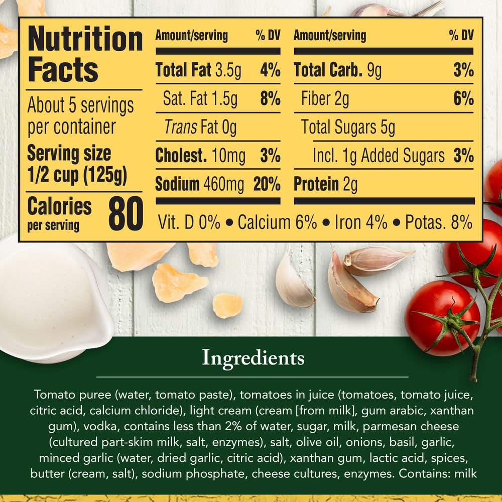 Ingredients: TOMATO PUREE (WATER, TOMATO PASTE), DICED TOMATOES IN JUICE (TOMATOES, TOMATO JUICE, CITRIC ACID, CALCIUM CHLORIDE), CREAM (FROM MILK), WATER, VODKA, CONTAINS LESS THAN 2% OF PARMESAN CHEESE (CULTURED PART-SKIM MILK, SALT, ENZYMES), MILK, SUGAR, SALT, ONIONS, OLIVE OIL, BASIL, GARLIC, XANTHAN GUM, LACTIC ACID, SPICES, BUTTER (CREAM, SALT), SODIUM PHOSPHATES, CHEESE CULTURES, ENZYMES. Contains: CONTAINS: MILK.