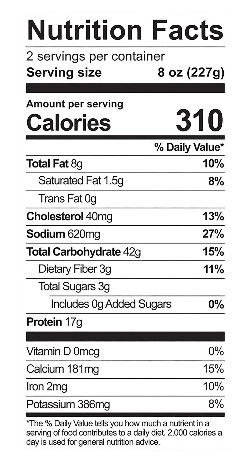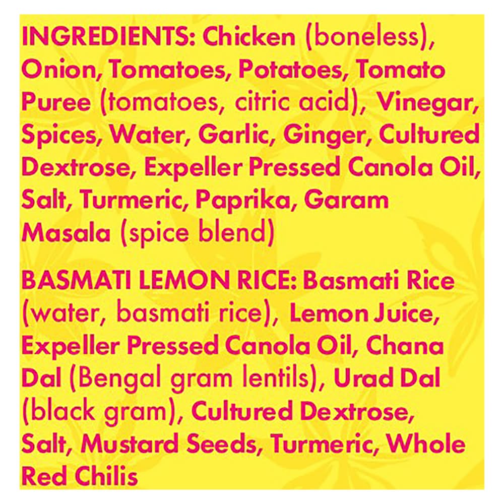 Ingredients: Chicken (Boneless), Onion, Tomatoes, Potatoes, Tomato Puree (Tomatoes, Citric Acid), Vinegar, Spices, Water, Garlic, Ginger, Cultured Dextrose, Expeller Pressed Canola Oil, Salt, Turmeric, Paprika, Garam Masala (Spice Blend). Basmati Lemon Rice: Basmati Rice (Water, Basmati Rice), Lemon Juice, Expeller Pressed Canola Oil, Chana Dal (Bengal Gram Lentils), Urad Dal (Black Gram), Cultured Dextrose, Salt, Mustard Seeds, Turmeric, Whole Red Chilis Contains: Mustard