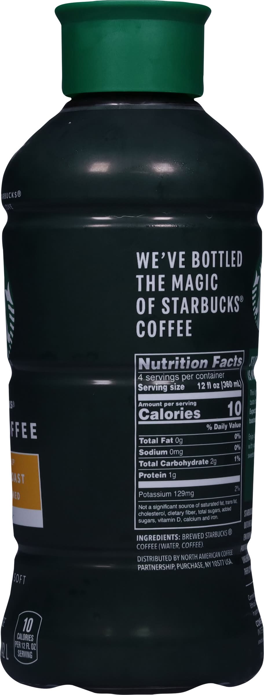 Premium coffee beverage. 10 calories per 12 fl oz serving. Crafted with the Starbucks coffee that you love. Mellow & soft. Starbucks blonde roast is mellow and soft. This light-bodied coffee has a vibrant taste thanks to its shorter roast time. Expect to experience notes of lightly toasted nuts and soft cocoa. Enjoy it on its own, or personalize it with your favorite milk, flavor or sweetener. We've bottled the magic of Starbucks coffee. • Flavor: Blonde roast unsweetened • North American Coffee Partnership, Purchase, NY, 10577 • Packaging: Reusable
