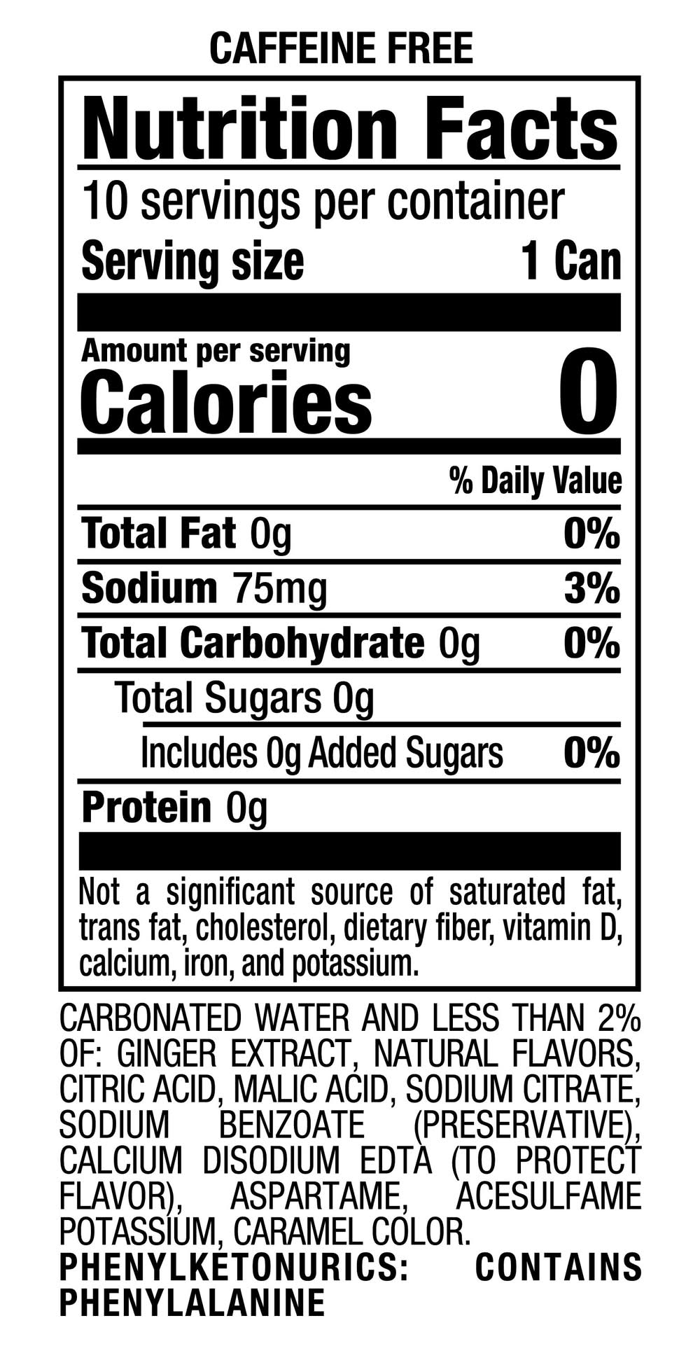 Ingredients: Carbonated Water and Less than 2% of: Ginger Extract, Natural Flavors, Citric Acid, Malic Acid, Sodium Citrate, Sodium Benzoate Preservative, Calcium Disodium EDTA to Protect Flavor, Aspartame, Acesulfame Potassium, Caramel Color.