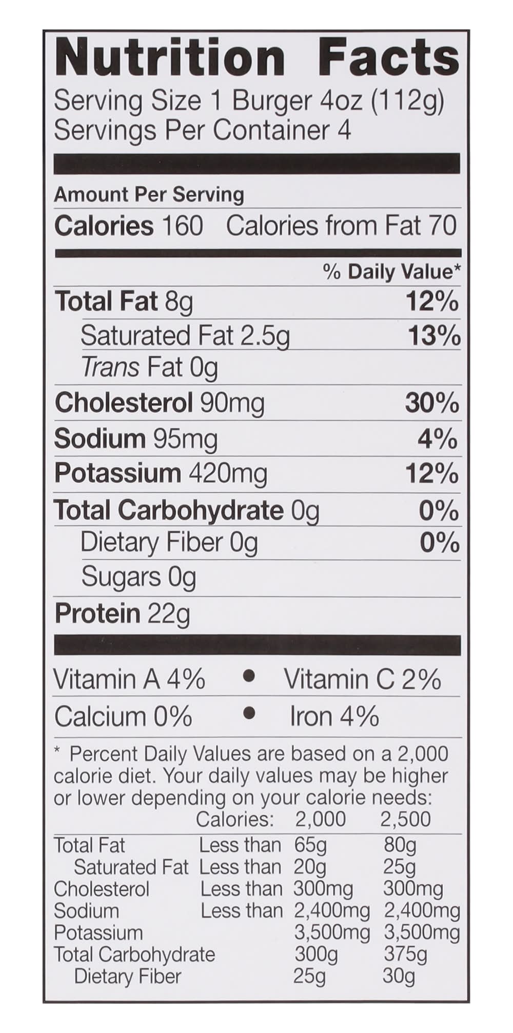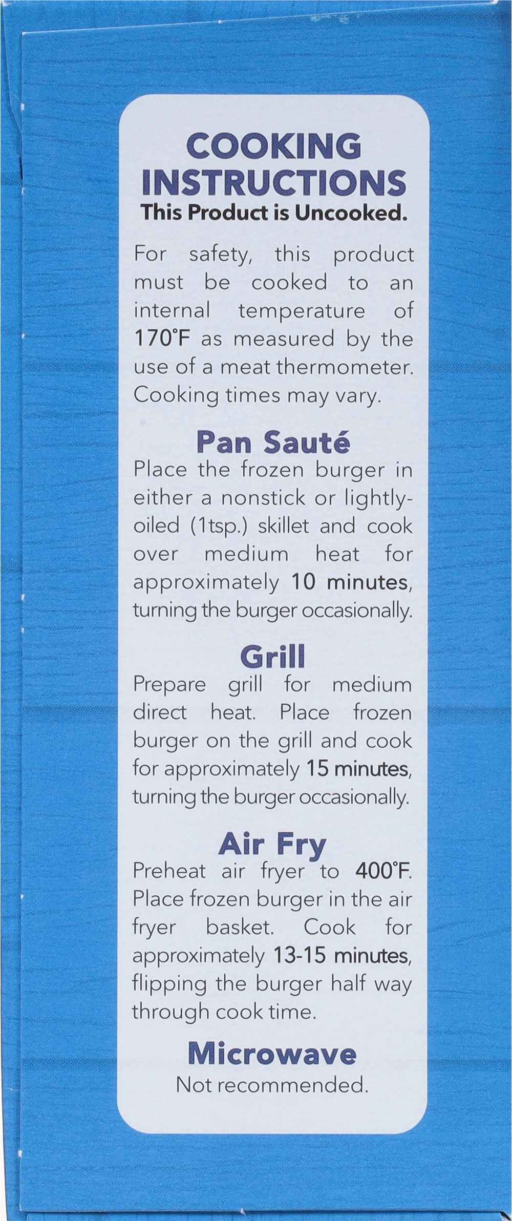 Keep frozen. ready to cook. suggested cooking: boxed burgers are uncooked. for safety, this product must be cooked to an internal temperature of 170 degrees f, as measured by the use of a meat thermometer. cooking times may vary. skillet: place frozen burger in either a nonstick or lightly oiled (1 tsp.) skillet and cook over medium heat for approximately 10 minutes, turning burger occasionally. grilled: prepare grill for medium direct heat. place frozen burger on the grill and cook for approximately 15 minutes, turning the burger occasionally. microwave: not recommended. safe handling: this product was prepared from inspected and passed meat and/or poultry. some food products may contain bacteria that could cause illness if the product is mishandled or cooked improperly. for your protection, follow these safe handling instructions. keep frozen. keep raw meat and poultry separate from other foods, wash working surfaces (including cutting boards), utensils, and hands after touching raw meat or poultry. cook thoroughly. keep hot foods hot. refrigerate leftovers immediately or discard.