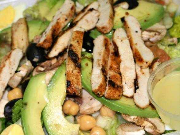 Romaine, cucumbers, tomatoes, mushrooms, chickpeas, avocado, and black olives with lemon dressing. Topped with grilled chicken.