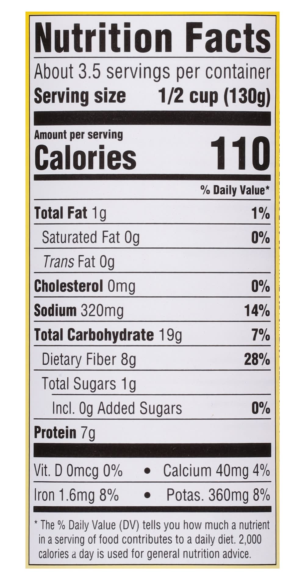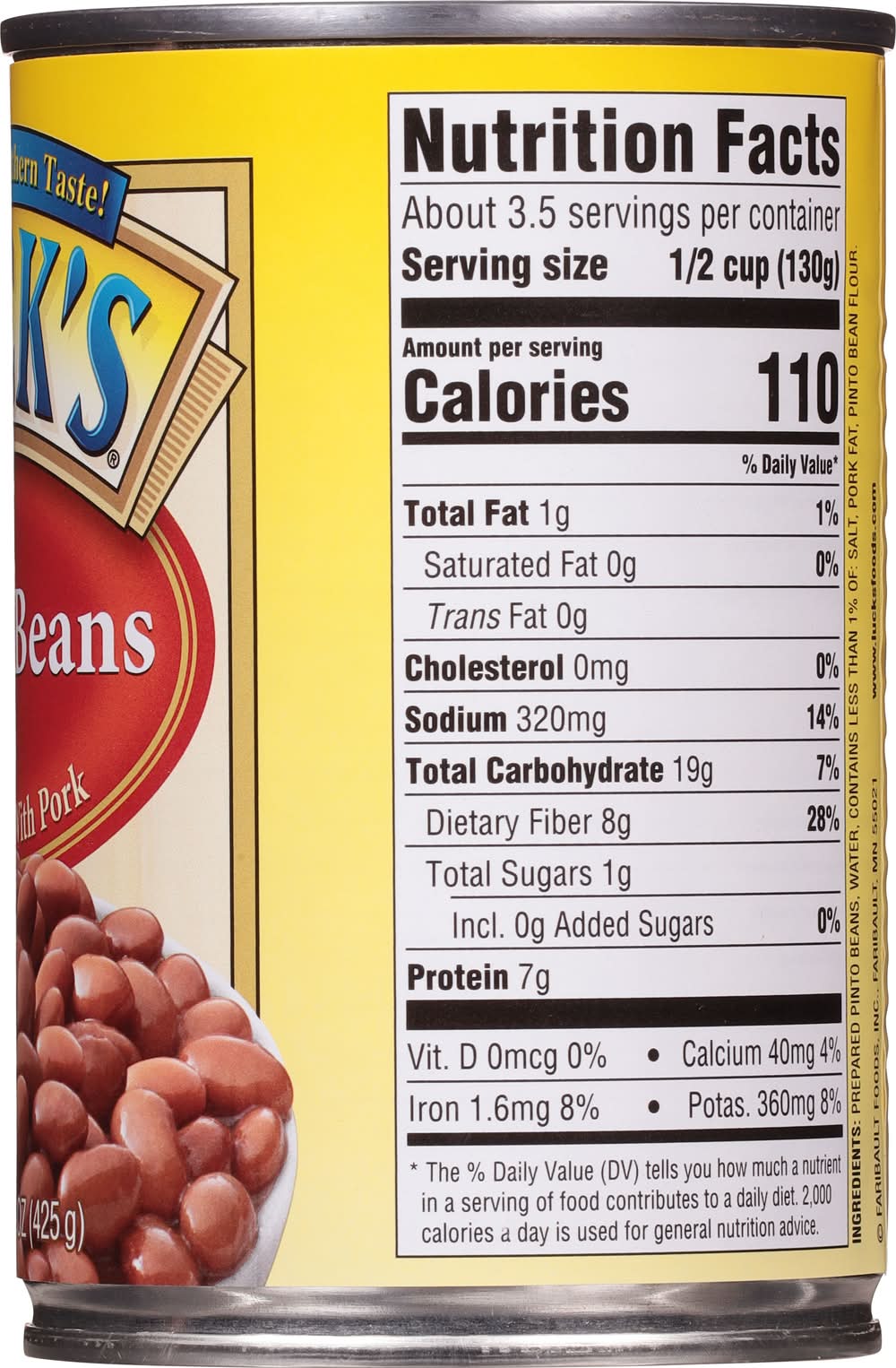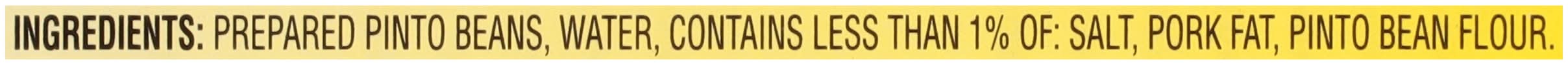 Ingredients: Prepared Pinto Beans, Water, Contains Less than 1% of: Salt, Pork Fat, Pinto Bean Flour