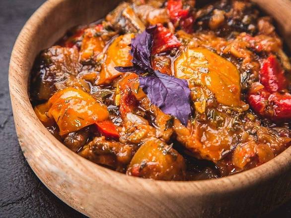 Adjapsandali is a vibrant Georgian vegetable stew made with eggplant, bell peppers, and tomatoes, simmered with aromatic herbs and spices. This hearty, vegan dish is perfect on its own.