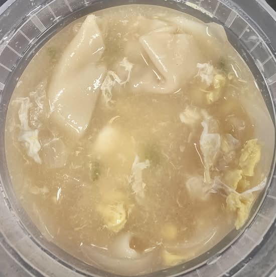 Sliced rice cake and dumplings with egg droppings with beef broth.