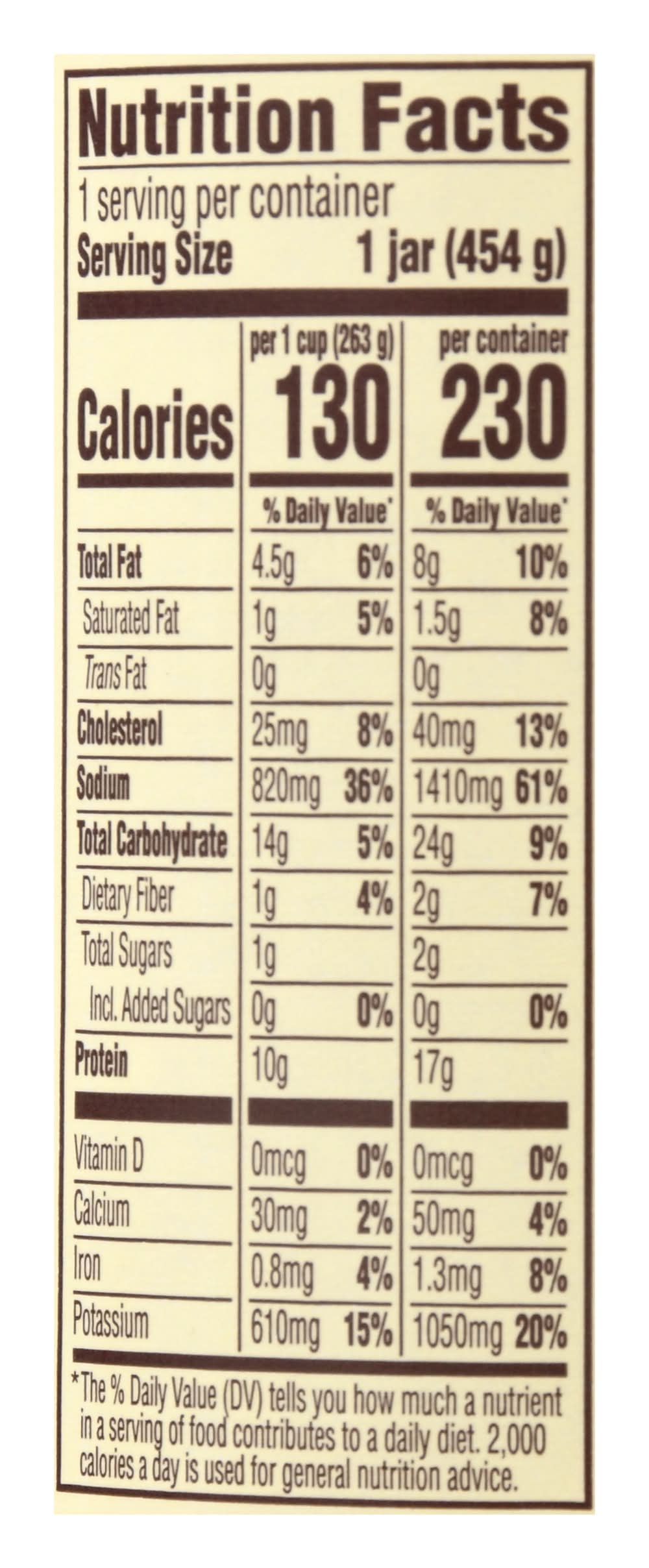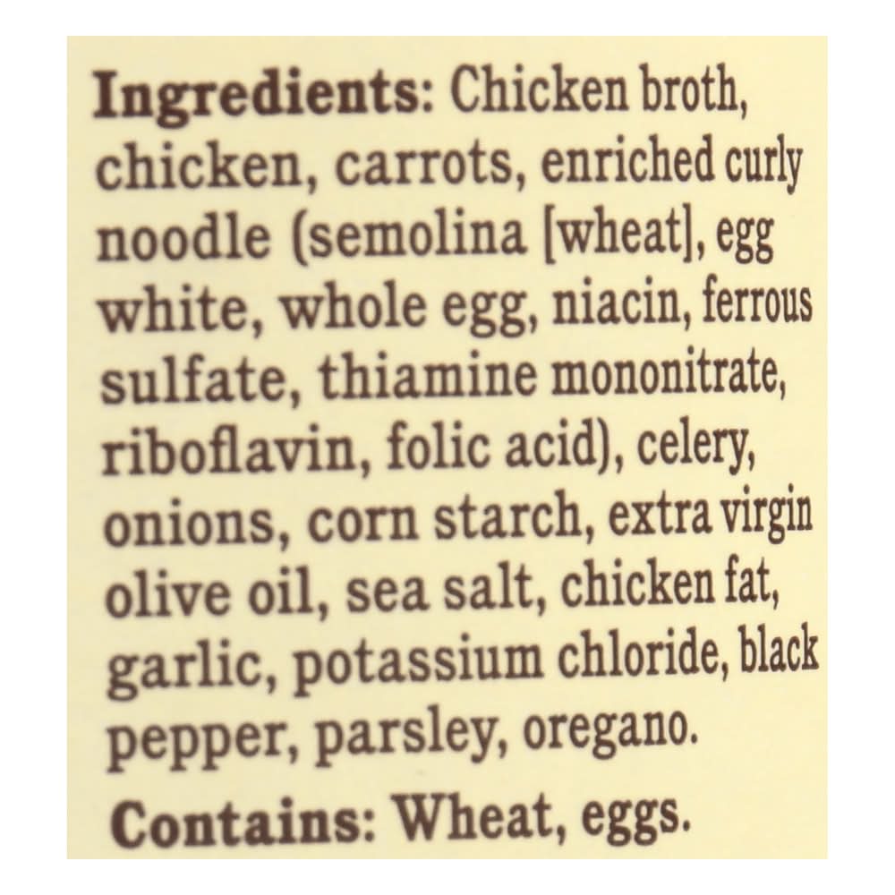 Ingredients: Chicken Broth, Chicken, Carrots, Enriched Curly Noodle Semolina [Wheat], Egg White, Whole Egg, Niacin, Ferrous Sulfate, Thiamine Mononitrate, Riboflavin, Folic Acid, Celery, Onions, Corn Starch, Extra Virgin Olive Oil, Sea Salt, Chicken Fat, Garlic, Potassium Chloride, Black Pepper, Parsley, Oregano, Parmesan Cheese Milk, Cheese Culture, Salt, Enzymes. Contains: Wheat, Eggs, Milk, Celery, Corn