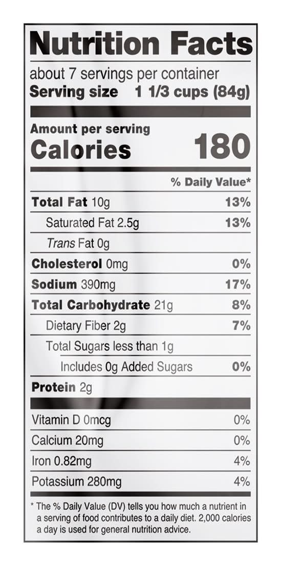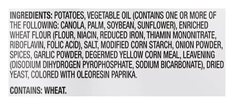 Ingredients: Potatoes, Vegetable Oil (Contains One or More of the Following: Canola, Palm, Soybean, Sunflower), Enriched Wheat Flour (Flour, Niacin, Reduced Iron, Thiamin Mononitrate, Riboflavin, Folic Acid), Salt, Modified Corn Starch, Onion Powder, Spices, Garlic Powder, Degermed Yellow Corn Meal, Leavening (Disodium Dihydrogen Pyrophosphate, Sodium Bicarbonate), Dried Yeast, Colored with Oleoresin Paprika Contains: Wheat, Soybeans, Corn