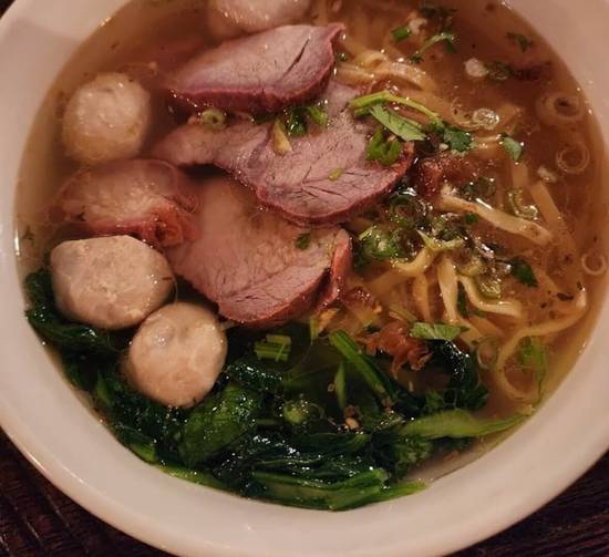 Vegetarian, gluten free. Egg noodle served with roasted pork, pork ball, and yu choy.
