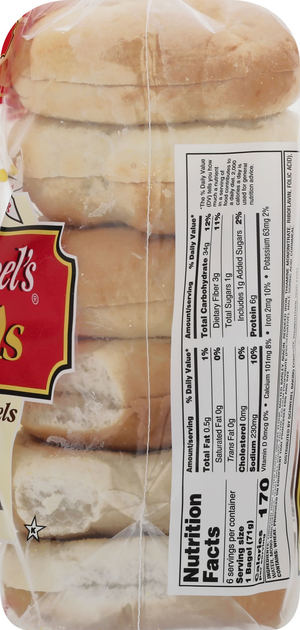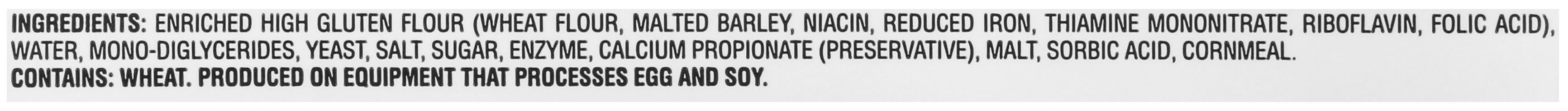 Ingredients: Enriched High Gluten Flour (Wheat Flour, Malted Barley, Niacin, Reduced Iron, Thiamine Mononitrate, Riboflavin, Folic Acid), Water, Mono-Diglycerides, Yeast, Salt, Enzyme, Calcium Propionate (Preservative), Malt, Sorbic Acid, Cornmeal Contains: Eggs, Soybeans, Wheat