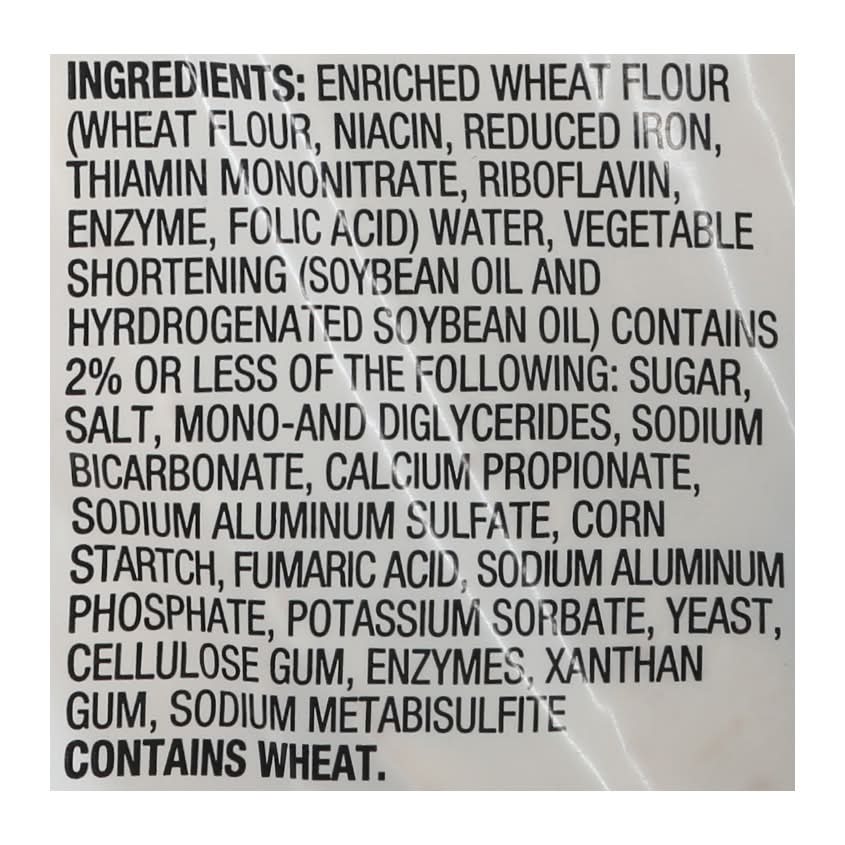 Ingredients: Enriched Wheat Flour (Wheat Flour, Niacin, Reduced Iron, Thiamin Mononitrate, Riboflavin, Enzyme, Folic Acid) Water, Vegetable Shortening (Soybean Oil and Hydrogenated Soybean Oil) Contains 2% or Less of the Following: Sugar, Salt, Mono- and Diglycerides, Sodium Bicarbonate, Calcium Propionate, Sodium Aluminum Sulfate, Corn Starch, Fumaric Acid, Sodium Aluminum Phosphate, Potassium Sorbate, Yeast, Cellulose Gum, Enzymes, Xanthan Gum, Sodium Metabisulfite. Contains: Wheat, Soybeans