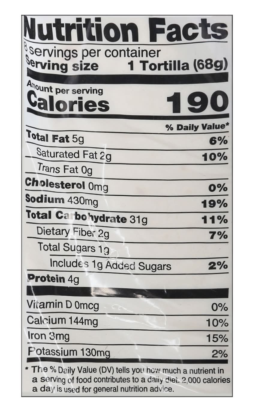 These tortillas are versatile for a variety of recipes, including burritos, wraps, and other culinary creations. • Size: 10" • Number of servings: 8 • Unfi, Providence, RI, 02908, Ph: 855-423-2630