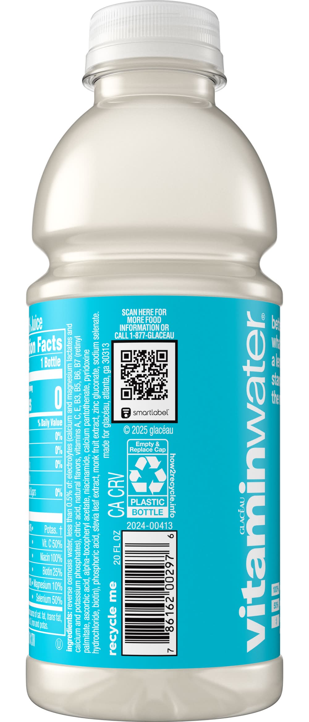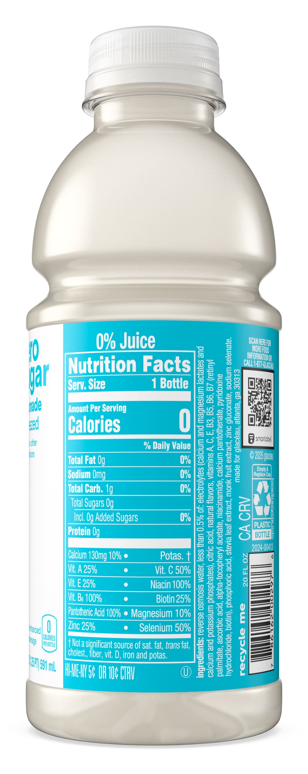 Ingredients: Reverse Osmosis Water, Less than 0.5% of: Electrolytes (Calcium and Magnesium Lactates and Calcium and Potassium Phosphates), Citric Acid, Natural Flavors, Vitamins A, C, E, B3, B5, B6, B7 (Retinyl Palmitate, Ascorbic Acid, Alpha-Tocopheryl Acetate, Niacinamide, Calcium Pantothenate, Pyridoxine Hydrochloride, Biotin), Phosphoric Acid, Stevia Leaf Extract, Monk Fruit Extract, Zinc Gluconate, Sodium Selenate