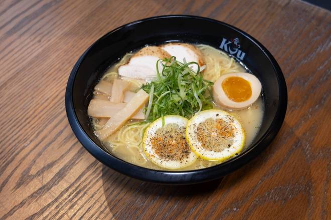 Dashi-salt and yuzu base chicken paitan broth, yuzu pepper chicken chashu, marinaded egg, bamboo, scallion, Lemon, black pepper, and Ichimi pepper.