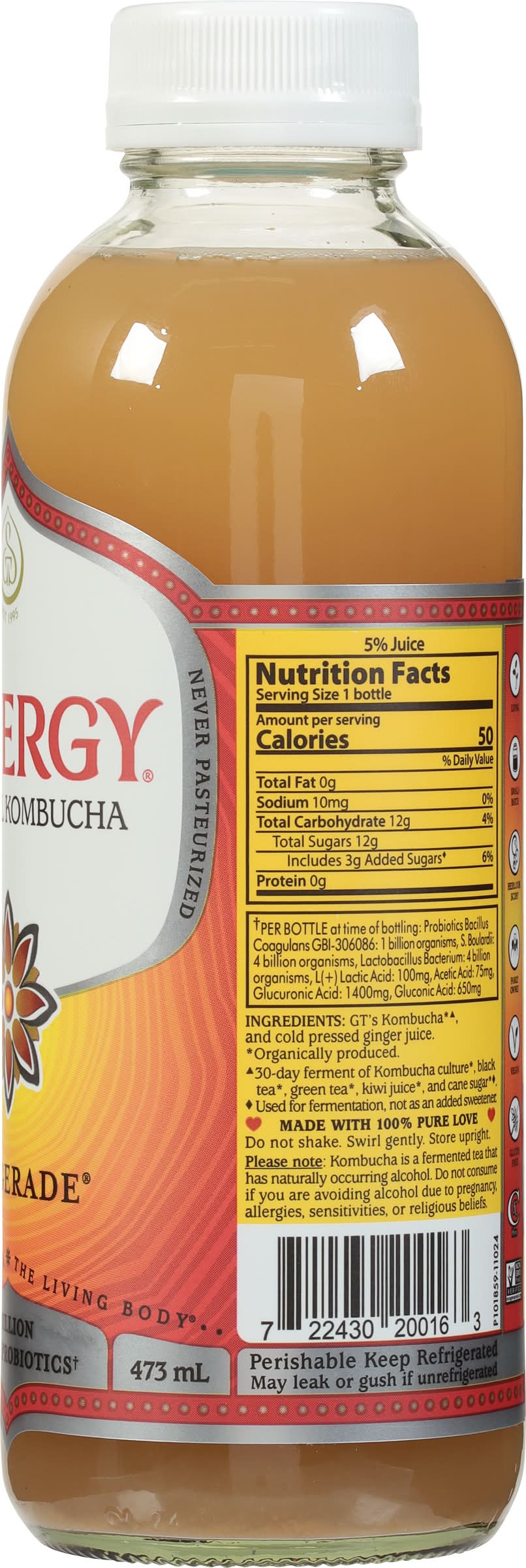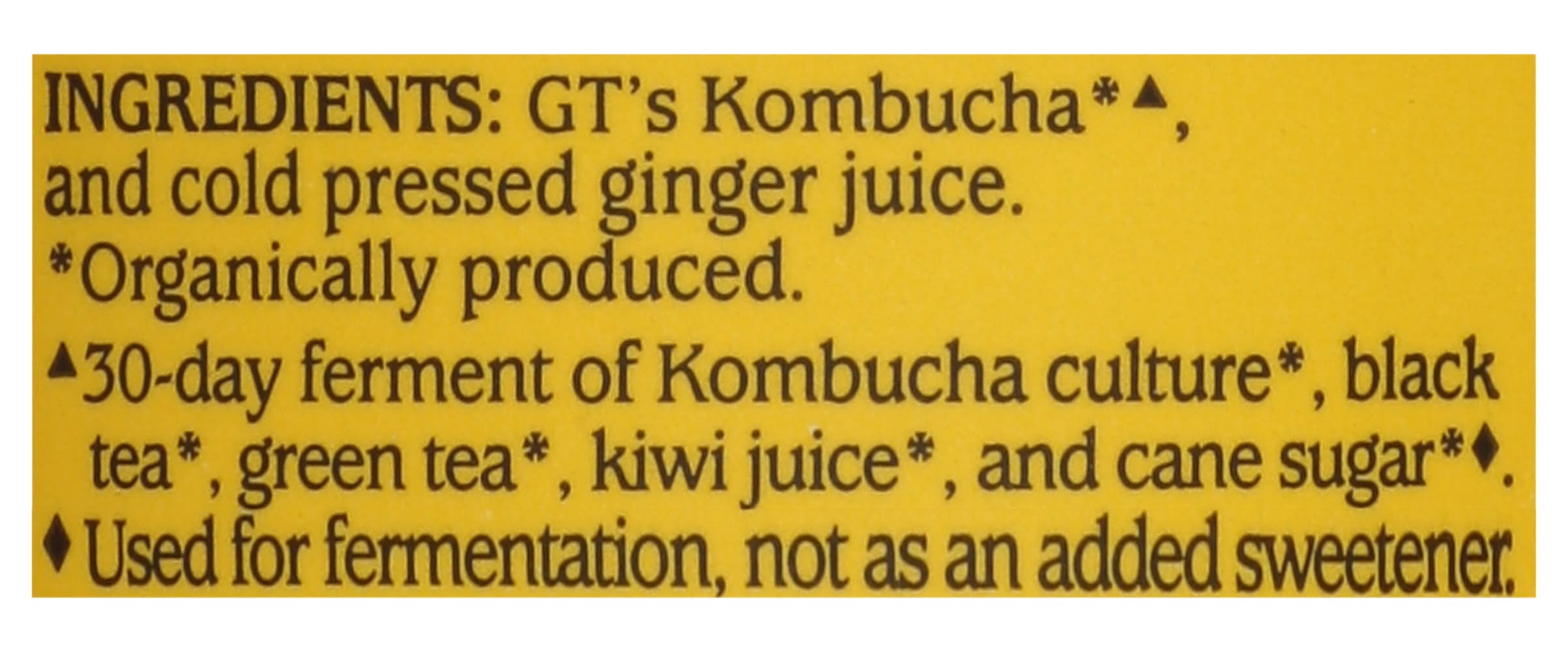 Ingredients: Gt's Kombucha*(a), and Cold Pressed Ginger Juice. * Organically Produced. (a) 30-Day Ferment of Kombucha Culture*, Black Tea*, Green Tea*, Kiwi Juice*, and Cane Sugar*(b). (b) Used for Fermentation, Not as an Added Sweetener