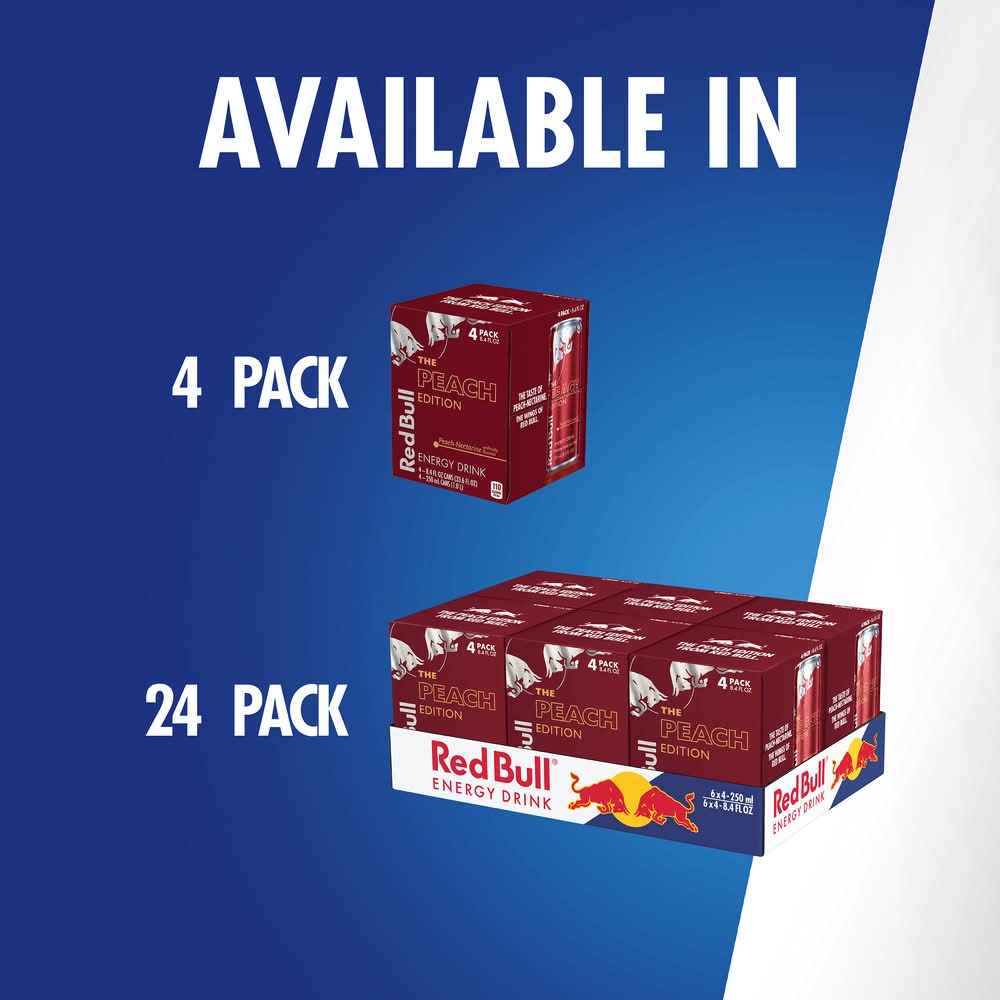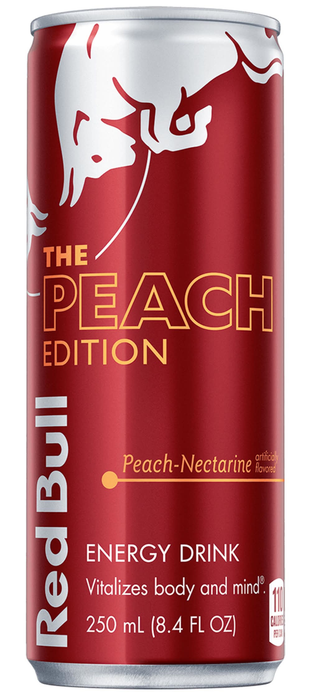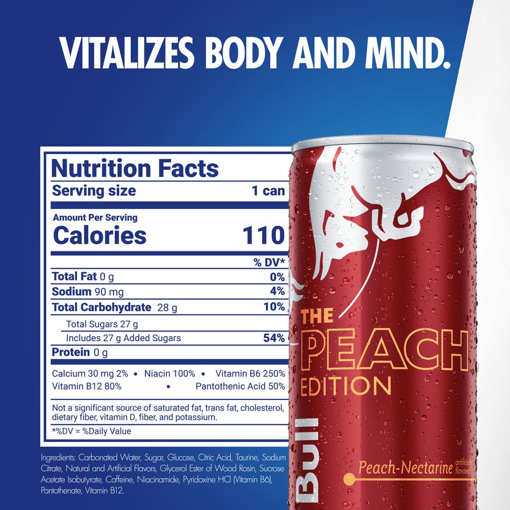 This Red Bull Peach Edition features the fresh taste of White Peach and Nectarine. This lightly carbonated beverage is enjoyed worldwide by fitness enthusiasts, athletes, gamers, students and travelers. A refreshing can of Red Bull makes an excellent partner for busy, active lifestyles. Each 8.4 fl oz can contains 80mg of caffeine per serving (about the same amount as a home-brewed cup of coffee) and 27g of sugar (comparable to sugar levels found in apple juice). It also includes Taurine, an amino acid naturally occurring in the human body, and B-group vitamins B6, B12, Niacin (B3) and Pantothenic Acid (B5). Available in 4-packs, 12-packs, 24-packs and Variety Packs. Comes in aluminum cans that can be recycled over and over. Always check can labels for the most updated product nutritional and ingredient information. Calcium and sugars values declared on labels may vary slightly depending on production locations. Always check can labels for most updated product nutritional and ingredient information. Calcium and sugars values declared on labels may vary slightly depending on production locations. • Brand: Red bull • Flavor: Peach-nectarine • Packaging: Reusable