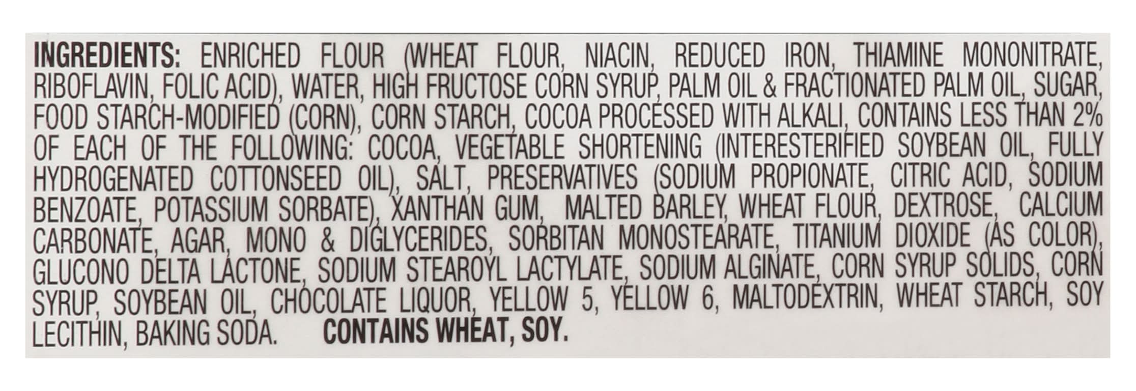 Ingredients: Enriched Flour (Wheat Flour, Niacin, Reduced Iron, Thiamine Mononitrate, Riboflavin, Folic Acid), Water, High Fructose Corn Syrup, Palm Oil & Fractionated Palm Oil, Sugar, Food Starch-Modified (Corn), Corn Starch, Cocoa Processed with Alkali, Contains Less than 2% of Each of the Following: Cocoa, Vegetable Shortening (Interestified Soybean Oil, Fully Hydrogenated Cototnseed Oil), Salt, Preservatives (Sodium Propionate, Citric Acid, Sodium Benzoate, Potassium Sorbate), Xanthan Gum, Malted Barley, Wheat Flour, Dextrose, Calcium Carbonate, Agar, Mono & Diglycerides, Sorbitan Monostearate, Titanium Dioxide (as Color), Glucono Delta Lactone, Sodium Stearoyl Lactylate, Sodium Alginate, Corn Syrup Solids, Corn Syrup, Soybean Oil, Chocolate Liquor, Yellow 5, Yellow 6, Maltodextrin, Wheat Starch, Soy Lecithin, Baking Soda Contains: Wheat, Soybeans