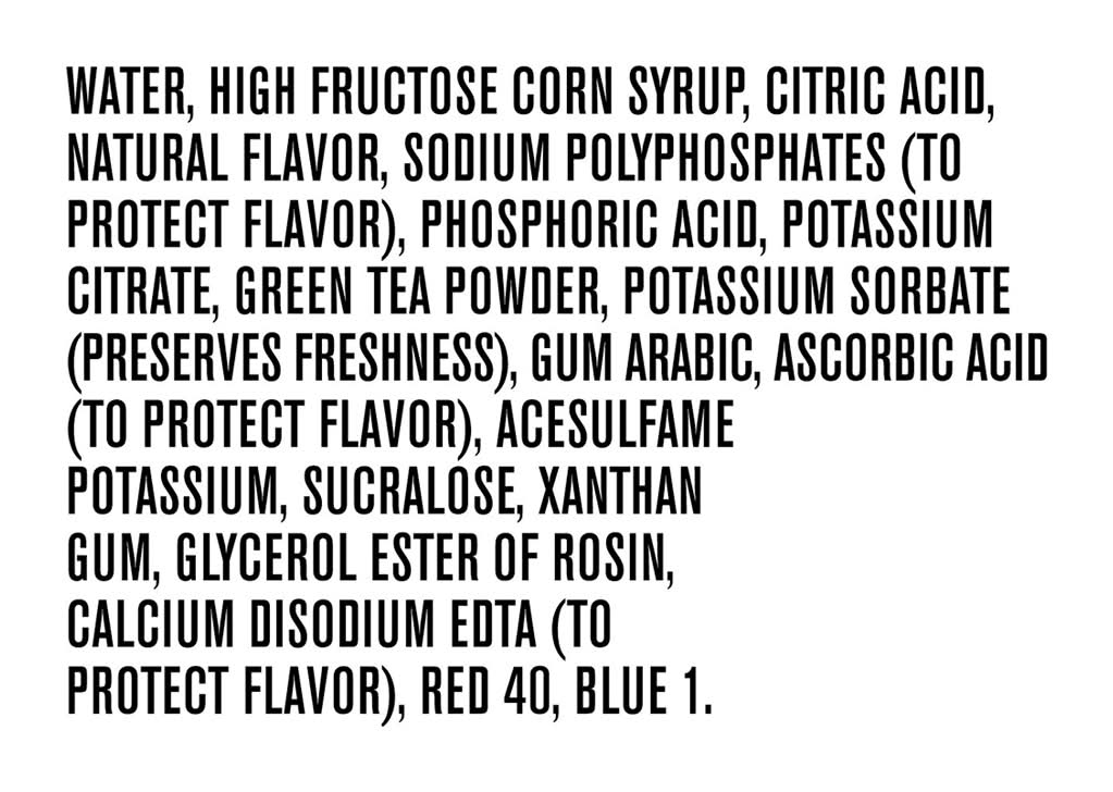 Ingredients: Water, High Fructose Corn Syrup, Citric Acid, Natural Flavor, Sodium Polyphosphates (to Protect Flavor), Phosphoric Acid, Potassium Citrate, Green Tea Powder, Potassium Sorbate (Preserves Freshness), Gum Arabic, Ascorbic Acid (to Protect Flavor), Acesulfame Potassium, Sucralose, Xanthan Gum, Glycerol Ester of Rosin, Calcium Disodium EDTA (to Protect Flavor), Red 40, Blue 1 Contains 25mg of caffeine