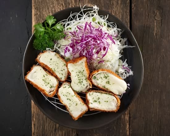 Mozzarella cheese wrapped in layer of pork. Served with rice, miso soup, and cabbage salad.