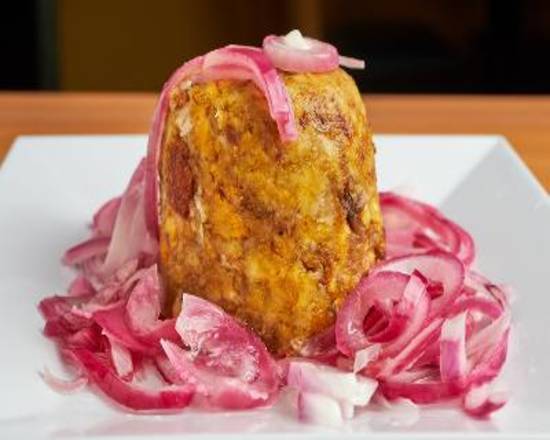 Crispy pork rinds mixed with garlic and mashed green plantains.