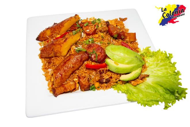 Colombian-style fried rice with chicken, pork cracklings, beef, chorizo, egg, onions, bell peppers, avocado, and sweet plantain