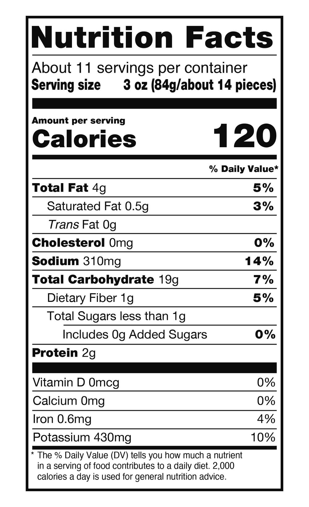 Ingredients: POTATOES, VEGETABLE OIL BLEND (SOYBEAN AND COTTONSEED), SALT, ANNATTO COLOR, DEXTROSE, SODIUM ACID PYROPHOSPHATE (TO RETAIN NATURAL COLOR), . Contains: Soybeans