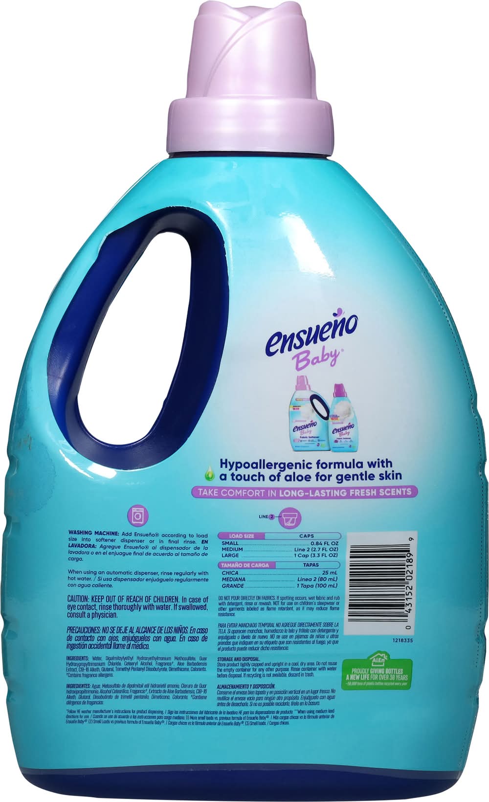 Directions for use: Washing Machine: Add Ensueno according to load size into softener dispenser or in final rinse. When using an automatic dispenser, rinse regularly with hot water. Load Size: Small - 0.84 fl oz caps; Load Size: Medium - Line 2 (2.7 fl oz) caps; Load Size: Large - 1 cap (3.3 fl oz) caps. Do not pour directly on fabrics. If spotting occurs, wet fabric and rub with detergent, rinse or rewash. Not for use on children's sleepwear or other garments labeled as flame retardant, as it may reduce flame resistance. Storage recommendation: Storage and Disposal: Store product tightly capped and upright in a cool, dry area. Do not reuse the empty container for any other purpose. Rinse container with water before disposal. If recycling is not available, discard in trash.