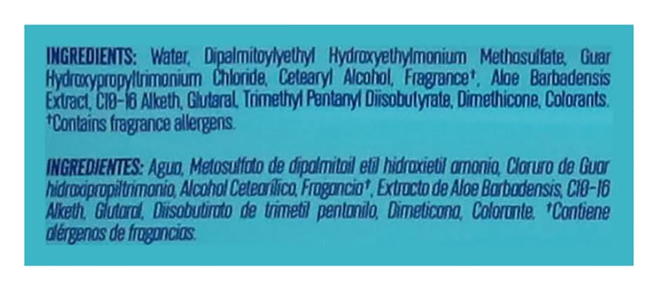Ingredients: Water, Dipalmitoylyethyl Hydroxyethylmonium Methosulfate, Guar Hydroxypropyltrimonium Chloride, Cetearyl Alcohol, Fragrance(a), Aloe Barbadensis Extract, C10-16 Alketh, Glutaral, Trimethyl Pentanyl Diisobutyrate, Dimethicone, Colorants. (a) Contains Fragrance Allergens