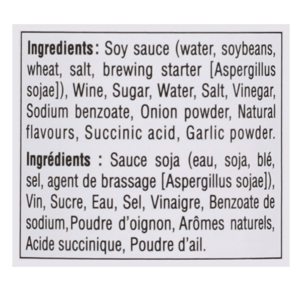 Ingredients: Soy Sauce (Water, Soybeans, Wheat, Salt, Brewing Starter [Aspergillus Sojae]), Wine, Sugar, Water, Salt, Vinegar, Sodium Benzoate, Onion Powder, Natural Flavours, Succinic Acid, Garlic Powder Contains: Soybeans, Wheat