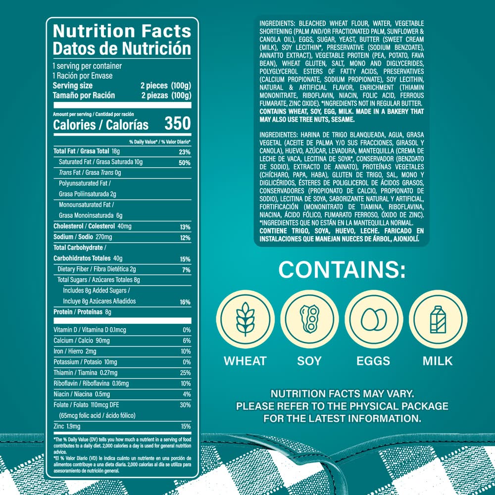 Ingredients: BLEACHED WHEAT FLOUR, WATER, VEGETABLE SHORTENING [PALM AND/OR FRACTIONATED PALM OIL, SUNFLOWER CANOLA OIL], EGGS, SUGAR, YEAST, BUTTER [SWEET CREAM (MILK), SOY LECITHIN*, PRESERVATIVE (SODIUM BENZOATE), ANNATTO EXTRACT], VEGETABLE PROTEIN [PEA, POTATO, FAVA BEAN], WHEAT GLUTEN, SALT, MONO AND DIGLYCERIDES, POLYGLYCEROL ESTERS OF FATTY ACIDS, PRESERVATIVES [CALCIUM PROPIONATE, SODIUM PROPIONATE], SOY LECITHIN, NATURAL ARTIFICIAL FLAVOR, ENRICHMENT [THIAMIN MONONITRATE, RIBOFLAVIN, NIACIN, FOLIC ACID, FERROUS FUMARATE, ZINC OXIDE], . *INGREDIENTS NOT IN REGULAR BUTTER. Contains: CONTAINS EGG, MILK, SOY, WHEAT.