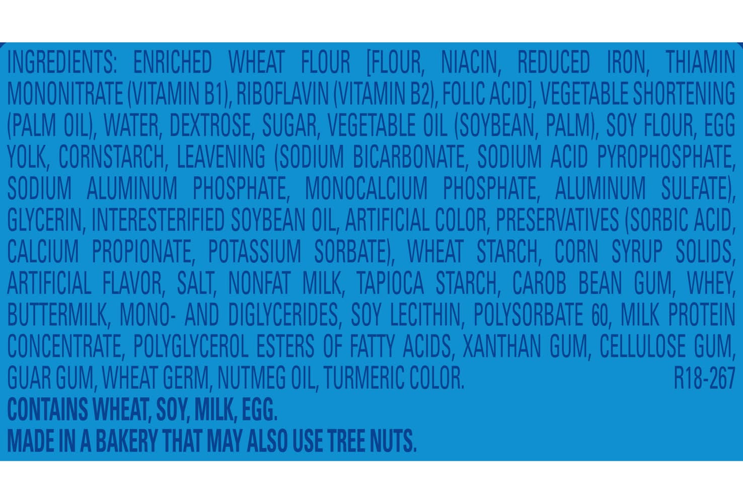 Ingredients: ENRICHED WHEAT FLOUR [FLOUR, NIACIN, REDUCED IRON, THIAMIN MONONITRATE (VITAMIN B1), RIBOFLAVIN (VITAMIN B2), FOLIC ACID], VEGETABLE SHORTENING (PALM OIL), WATER, DEXTROSE, SUGAR, VEGETABLE OIL [SOYBEAN OIL, PALM OIL], SOY FLOUR, EGG YOLK, CORNSTARCH, LEAVENING [BAKING SODA, SODIUM ACID PYROPHOSPHATE, SODIUM ALUMINUM PHOSPHATE, SODIUM ALUMINUM SULFATE], GLYCERIN, INTERESTERIFIED SOYBEAN OIL, ARTIFICIAL COLOR, PRESERVATIVES [SORBIC ACID, CALCIUM PROPIONATE, POTASSIUM SORBATE], WHEAT STARCH, CORN SYRUP SOLIDS, ARTIFICIAL FLAVOR, SALT, NONFAT MILK, TAPIOCA STARCH, CAROB BEAN GUM, WHEY, BUTTERMILK, MONO- AND DIGLYCERIDES, SOY LECITHIN, POLYSORBATE 60, MILK PROTEIN CONCENTRATE, POLYGLYCEROL ESTERS OF FATTY ACIDS, XANTHAN GUM, CELLULOSE GUM, GUAR GUM, WHEAT GERM, NUTMEG OIL, TURMERIC (COLOR), .