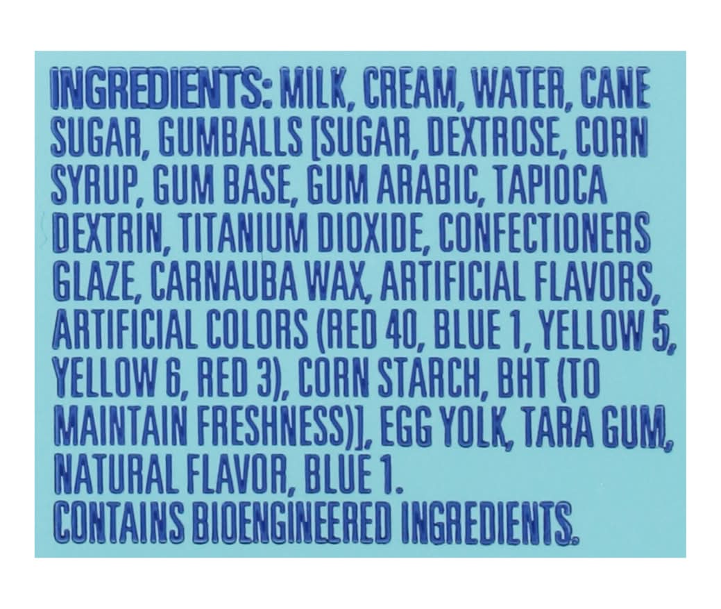 Ingredients: Milk, Cream, Water, Cane Sugar, Gumballs [Sugar, Dextrose, Corn Syrup, Gum Base, Gum Arabic, Tapioca Dextrin, Titanium Dioxide, Confectioners Glaze, Carnauba Wax, Artificial Flavors, Artificial Colors (Red 40, Blue 1, Yellow 5, Yellow 6, Red 3), Corn Starch, BHT (to Maintain Freshness)], Egg Yolk, Tara Gum, Natural Flavor, Blue 1 Contains: Milk, Corn, Eggs