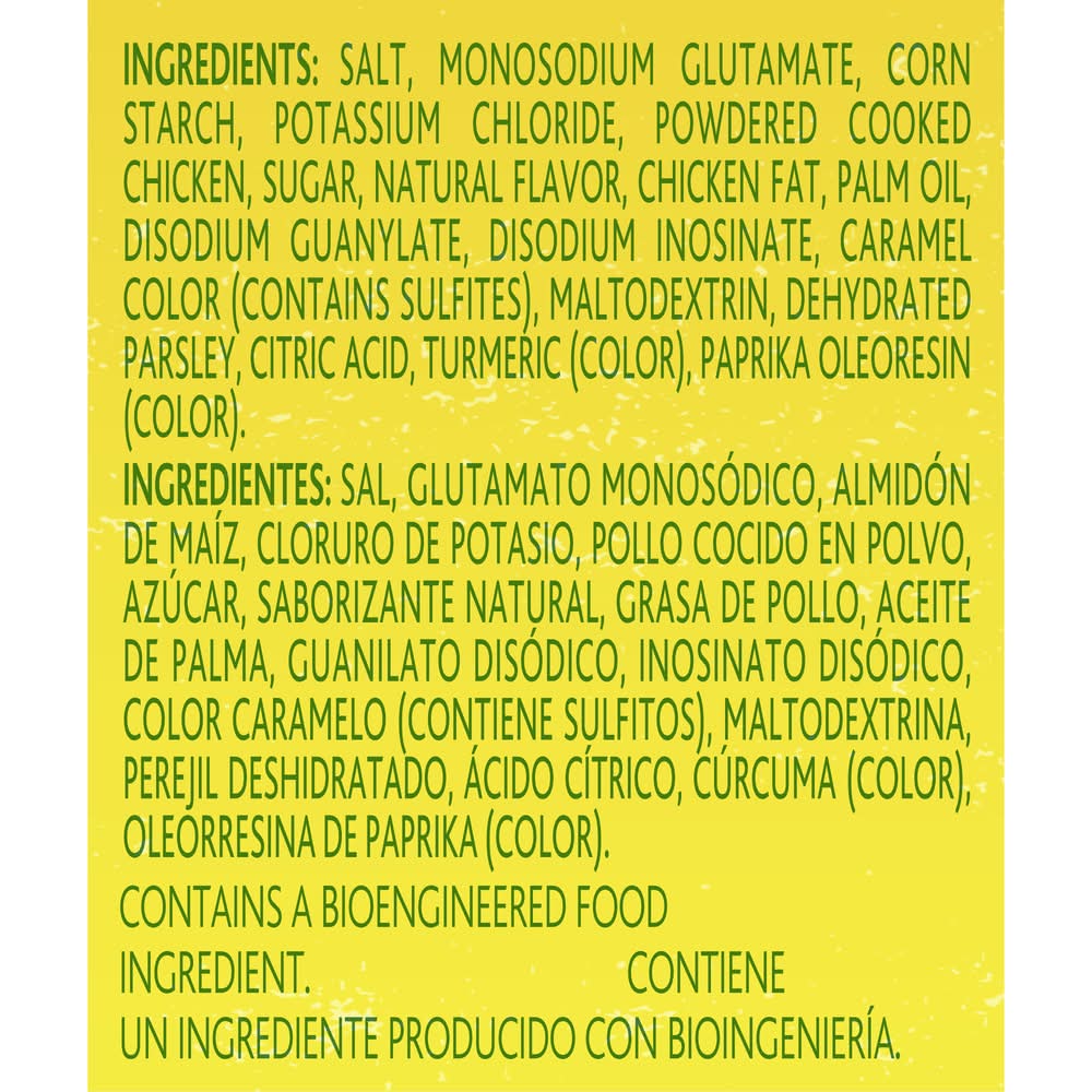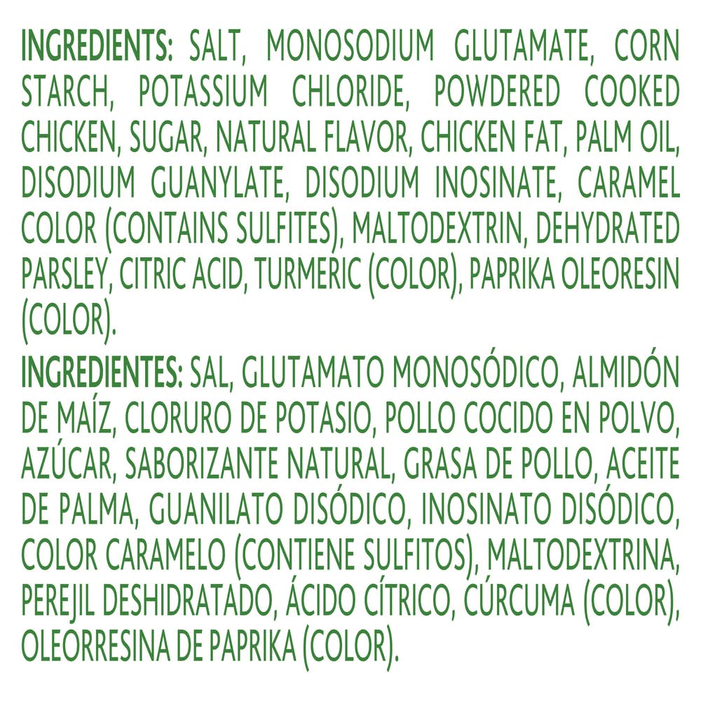 Ingredients: Salt, Monosodium Glutamate, Potassium Chloride, Corn Starch, Palm Oil, Powdered Cooked Chicken, Sugar, Natural Flavor, Chicken Fat, Silicon Dioxide Prevents Caking, Disodium Guanylate, Disodium Inosinate, Caramel Color Contains Sulfites, Maltodextrin, Dehydrated Parsley, Citric Acid, Turmeric Color, Paprika Oleoresin Color.