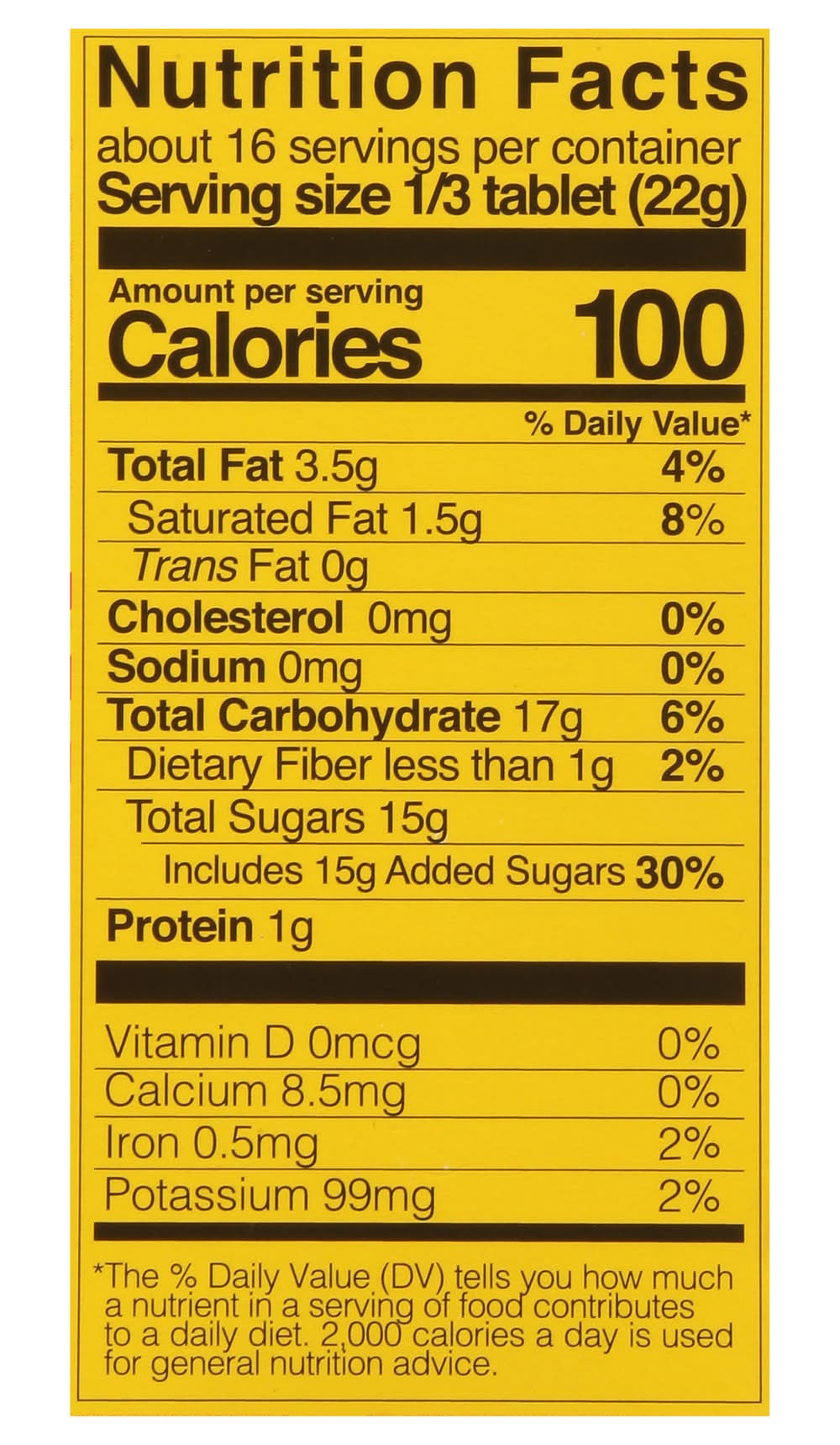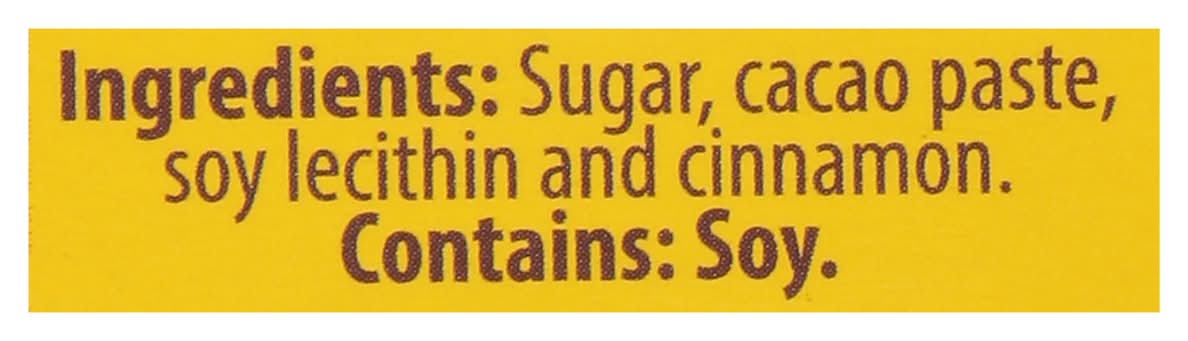 Ingredients: Sugar, Cocoa Paste, Soy Lecithin and Cinnamon Contains: Soybeans