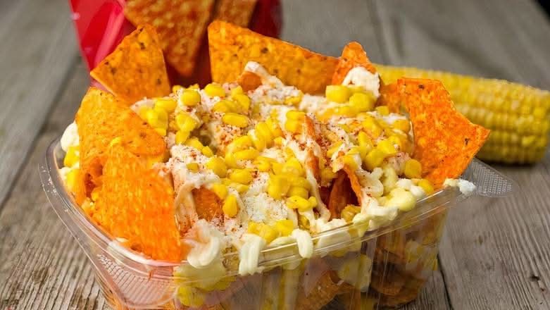 Chips with corn, mayo, butter, granulated cheese, Tapatio, and your choice of chips: Flaming Hot Cheetos, Xxtra Flamin Hot Cheetos, Tostitos, Takis, Doritos, Hot Cheetos Fries, and Doraditas.