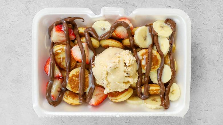 25 pieces of mini pancakes served with choice of ice cream and choice of toppings.