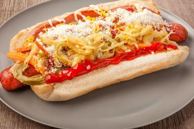 A hot dog topped with shredded cabbage, pickled jalapeños, shredded cheese, ketchup, and crumbled cheese.