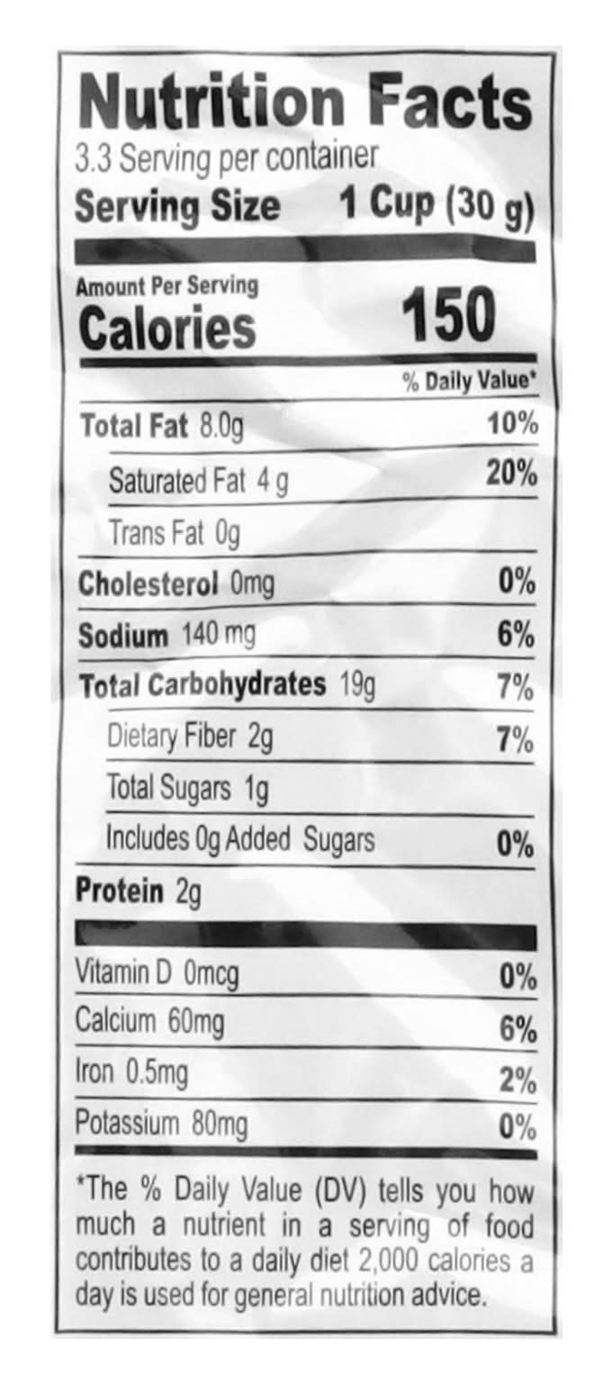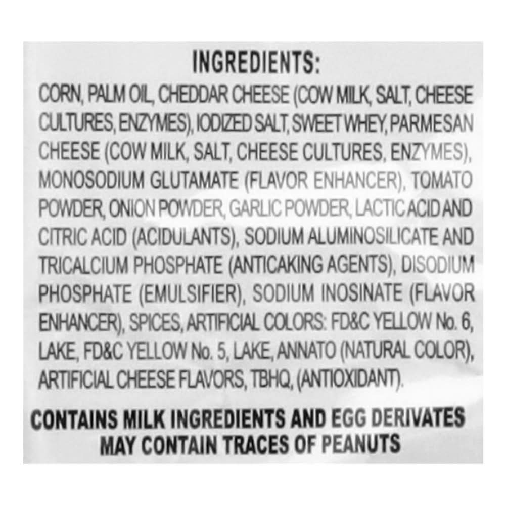 Ingredients: Corn, Palm Oil, Cheddar Cheese (Cow Milk, Salt, Cheese Cultures, Enzymes), Iodized Salt, Sweet Whey, Parmesan Cheese (Cow Milk, Salt, Cheese Cultures, Enzymes), Monosodium Glutamate (Flavor Enhancer), Tomato Powder, Onion Powder, Garlic Powder, Lactic Acid and Citric Acid (Acidulants), Sodium Aluminosilicate and Tricalcium Phosphate (Anticaking Agents), Disodium Phosphate (Emulsifier), Sodium Inosinate (Flavor Enhancer), Spices, Artificial Colors: FD&C Yellow 6, Lake, FD&C Yellow 5, Lake, Annato (Natural Color), Artificial Cheese Flavors, TBHQ, (Antioxidant) Contains: Milk, Eggs, Corn, Peanuts