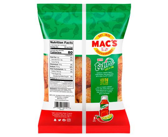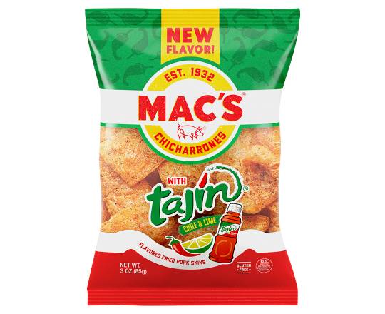Crunchy, Savory Mac's Pork Rinds, Now Seasoned with Real Tajin Clasico Full of Tangy, Vibrant Chile Lime Taste that Fills Your Mouth with Flavor and Keeps You Coming Back for More! • Brand: Mac's • Flavor: Tajin chile - lime • gluten-free