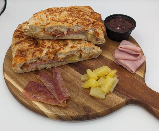 BBQ sauce, Ham, Bacon, Pineapple, and Whole Milk Mozzarella. Includes 1 FREE side of Dipping sauce.