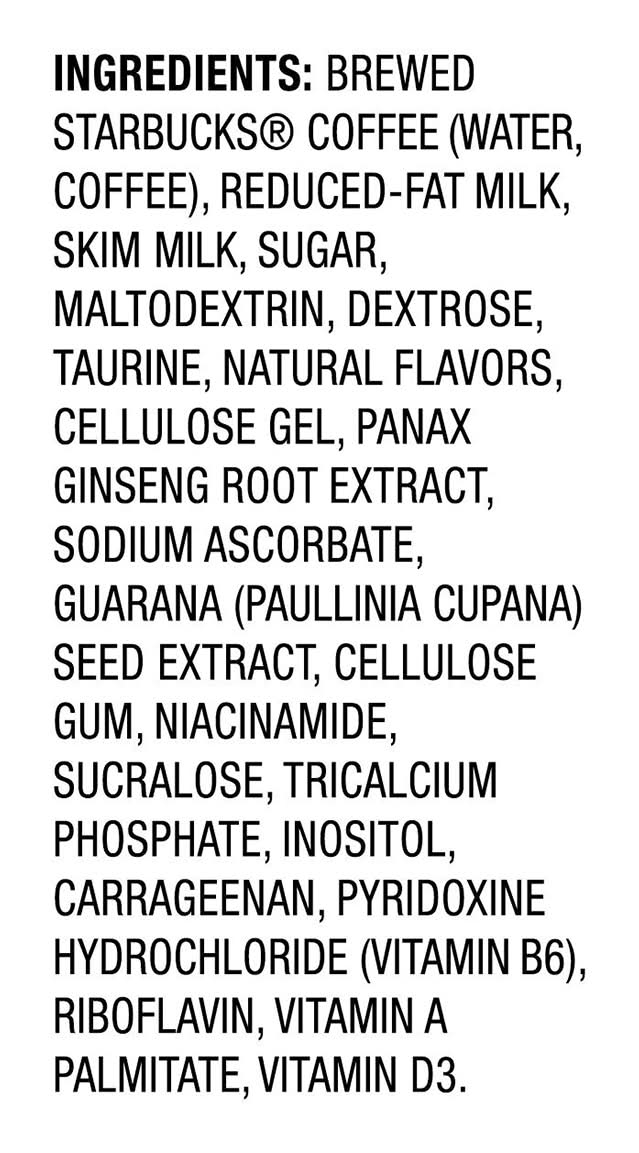 Ingredients: Brewed Starbucks Coffee (Water, Coffee), Reduced-Fat Milk, Skim Milk, Sugar, Maltodextrin, Dextrose, Taurine, Natural Flavors, Cellulose Gel, Panax Ginseng Root Extract, Sodium Ascorbate, Guarana (Paullinia Cupana) Seed Extract, Cellulose Gum, Niacinamide, Sucralose, Tricalcium Phosphate, Inositol, Carrageenan, Pyridoxine Hydrochloride (Vitamin B6), Riboflavin, Vitamin A Palmitate, Vitamin D3 Contains: Milk Contains 75mg of caffeine
