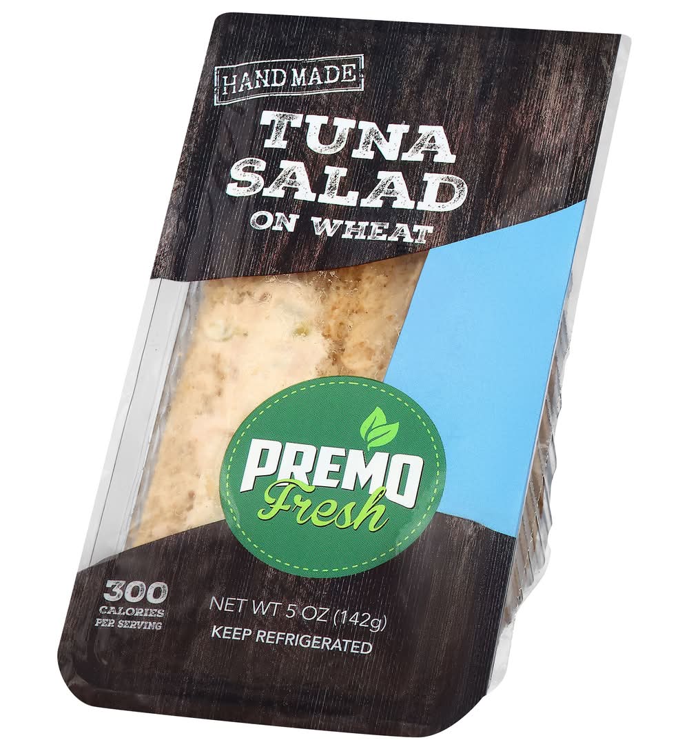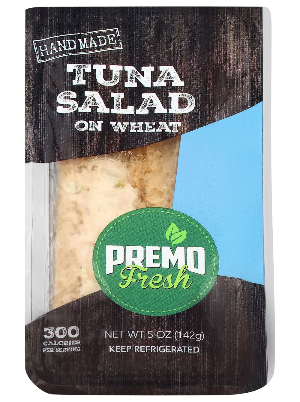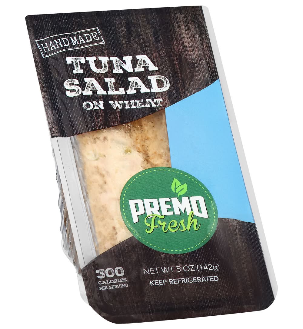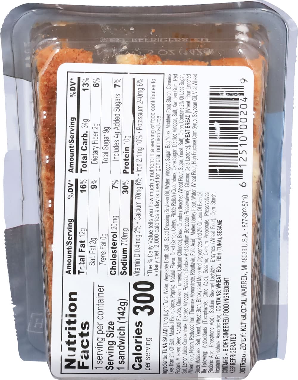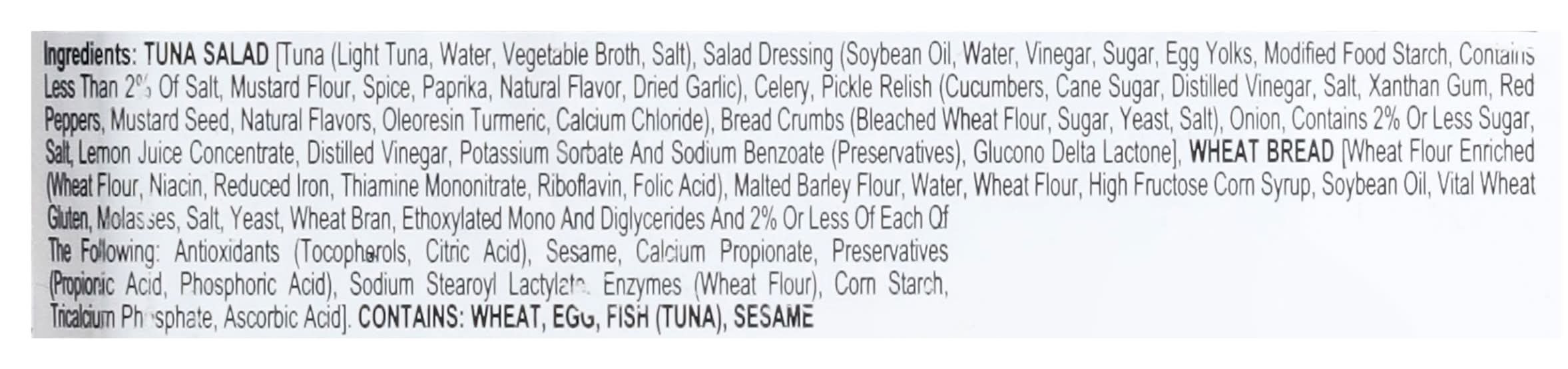 Ingredients: Tuna Salad [Tuna (Light Tuna, Water, Vegetable Broth, Salt), Salad Dressing (Soybean Oil, Water, Vinegar, Sugar, Egg Yolks, Modified Food Starch, Contains Less than 2% of Salt, Mustard Flour, Spice, Paprika, Natural Flavor, Dried Garlic), Celery, Pickle Relish (Cucumbers, Cane Sugar, Distilled Vinegar, Salt, Xanthan Gum, Red Peppers, Mustard Seed, Natural Flavors, Oleoresin Turmeric, Calcium Chloride), Bread Crumbs (Bleached Wheat Flour, Sugar, Yeast, Salt), Onion, Contains 2% or Less Sugar, Salt, Lemon Juice Concentrate, Distilled Vinegar, Potassium Sorbate and Sodium Benzoate (Preservatives), Glucono Delta Lactone], Wheat Bread [Wheat Flour Enriched (Wheat Flour, Niacin, Reduced Iron, Thiamine Mononitrate, Riboflavin, Folic Acid), Malted Barley Flour, Water, Wheat Flour, High Fructose Corn Syrup, Soybean Oil, Vital Wheat Gluten, Molasses, Salt, Yeast, Wheat Bran, Ethoxylated Mono and Diglycerides and 2% or Less of Each of the Following: Antioxidants (Tocopherols, Citric Acid), Sesame, Calcium Propionate, Preservatives (Propionic Acid, Phosphoric Acid), Sodium Stearoyl Lactylate, Enzymes (Wheat Flour), Corn Starch, Tricalcium Phosphate, Ascorbic Acid] Contains: Wheat, Eggs, Fish, Tuna, Sesame, Soybeans, Mustard, Celery, Barley, Gluten